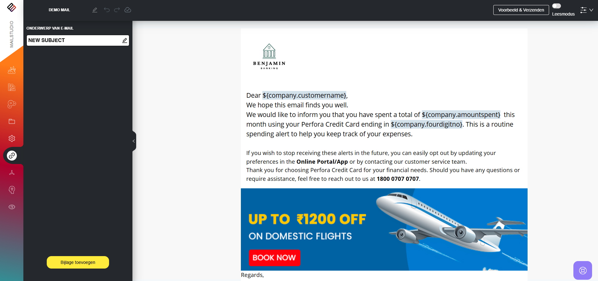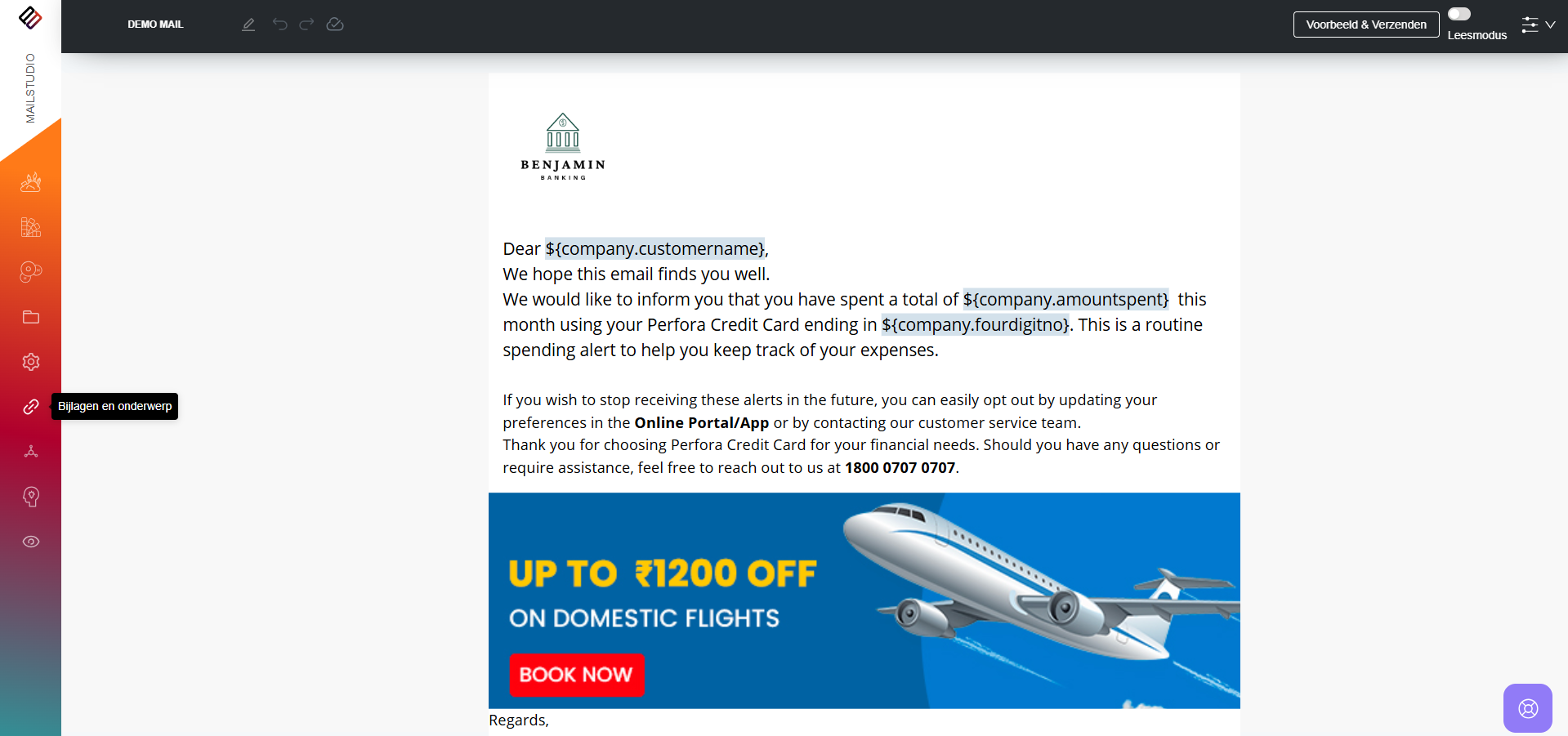 Gebruikers kunnen het onderwerp van de e-mail instellen tijdens het maken van de e-mailsjabloon. Als ze de onderwerpregel echter later willen bewerken, kan dit via het menu "Bijlagen en onderwerp".