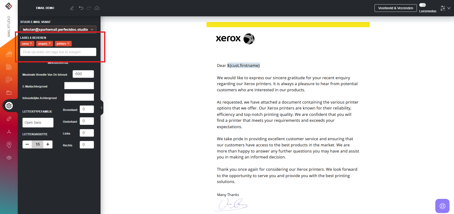 Net als bij het documentsysteem kunt u met de functie "Tags beheren" specifieke trefwoorden koppelen aan e-mailsjablonen. Deze tags maken het zoeken naar sjablonen eenvoudiger. Voer gewoon een tag in en druk op "Enter" om deze te koppelen aan de e-mailsjabloon.