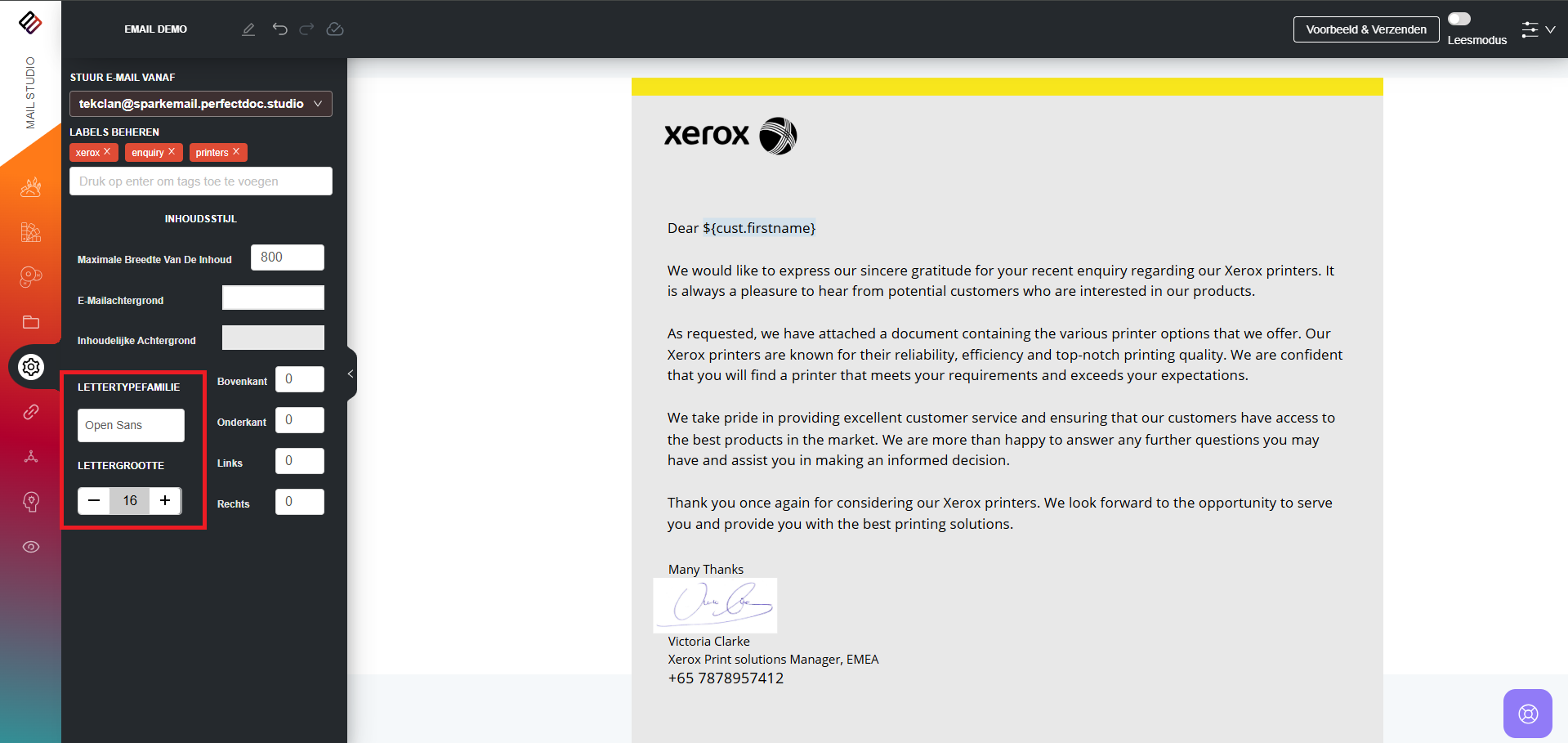 Geef met deze optie de standaardlettertypestijl en -grootte voor de e-mailsjabloon op. Deze instellingen worden in de hele sjabloon toegepast, tenzij ze voor specifieke secties worden gewijzigd.