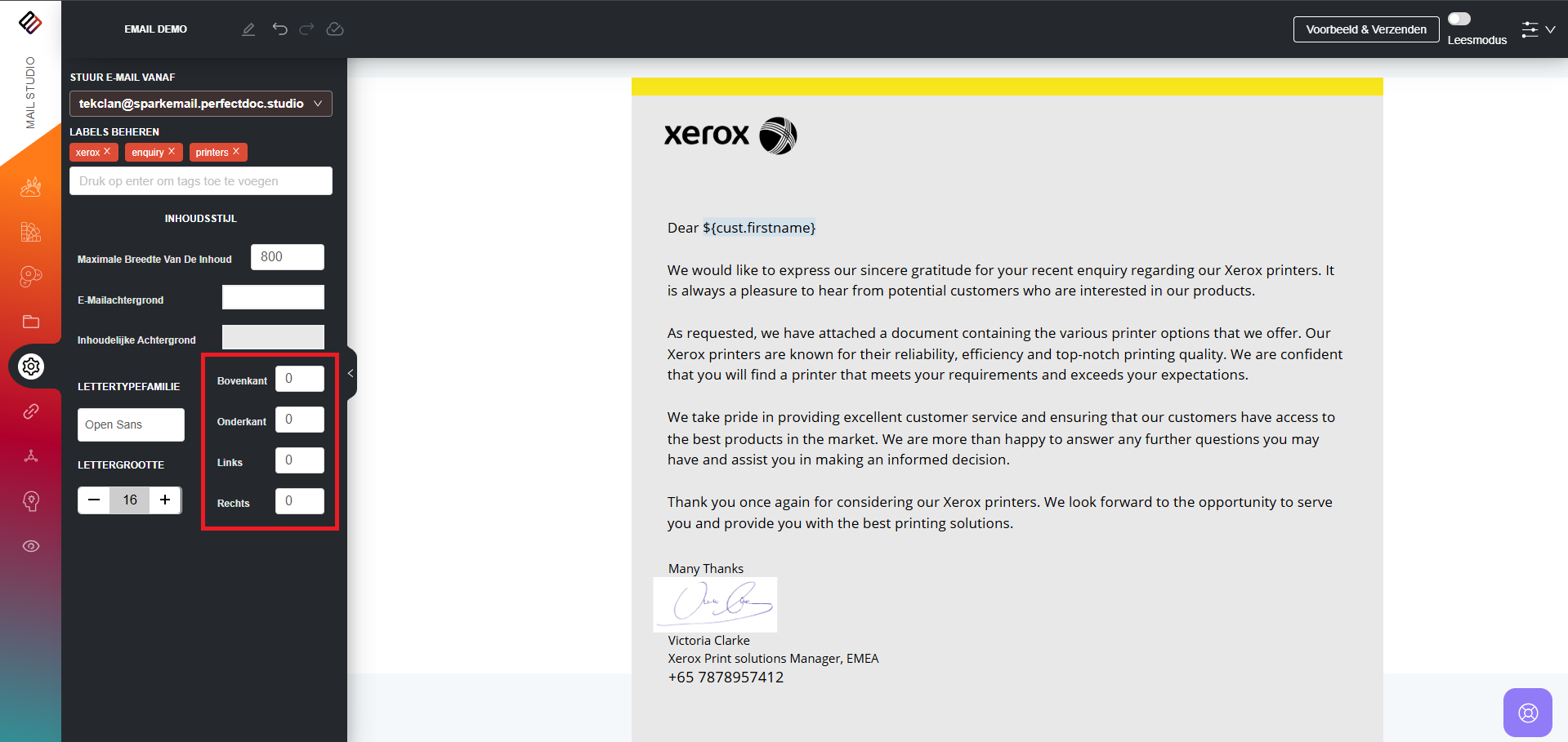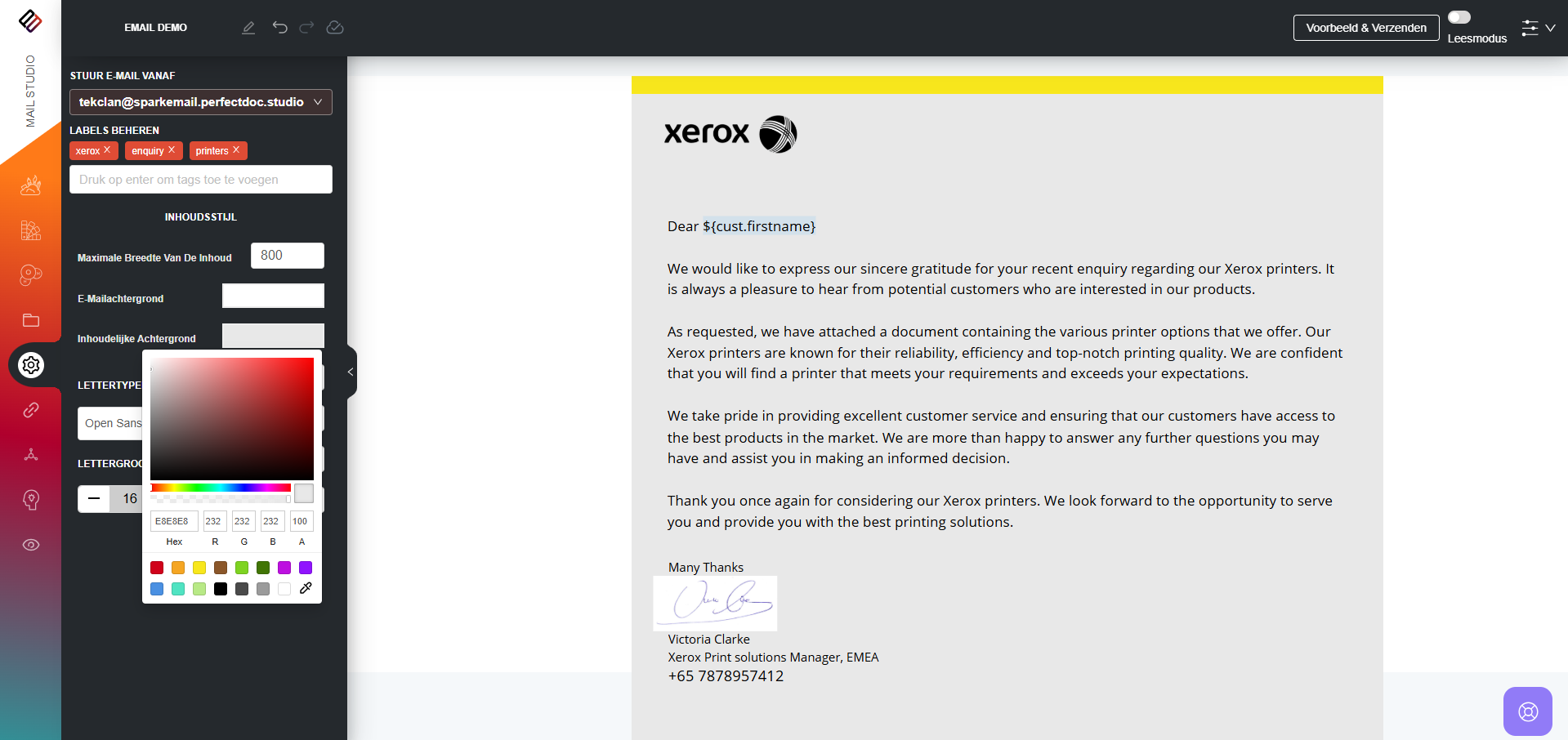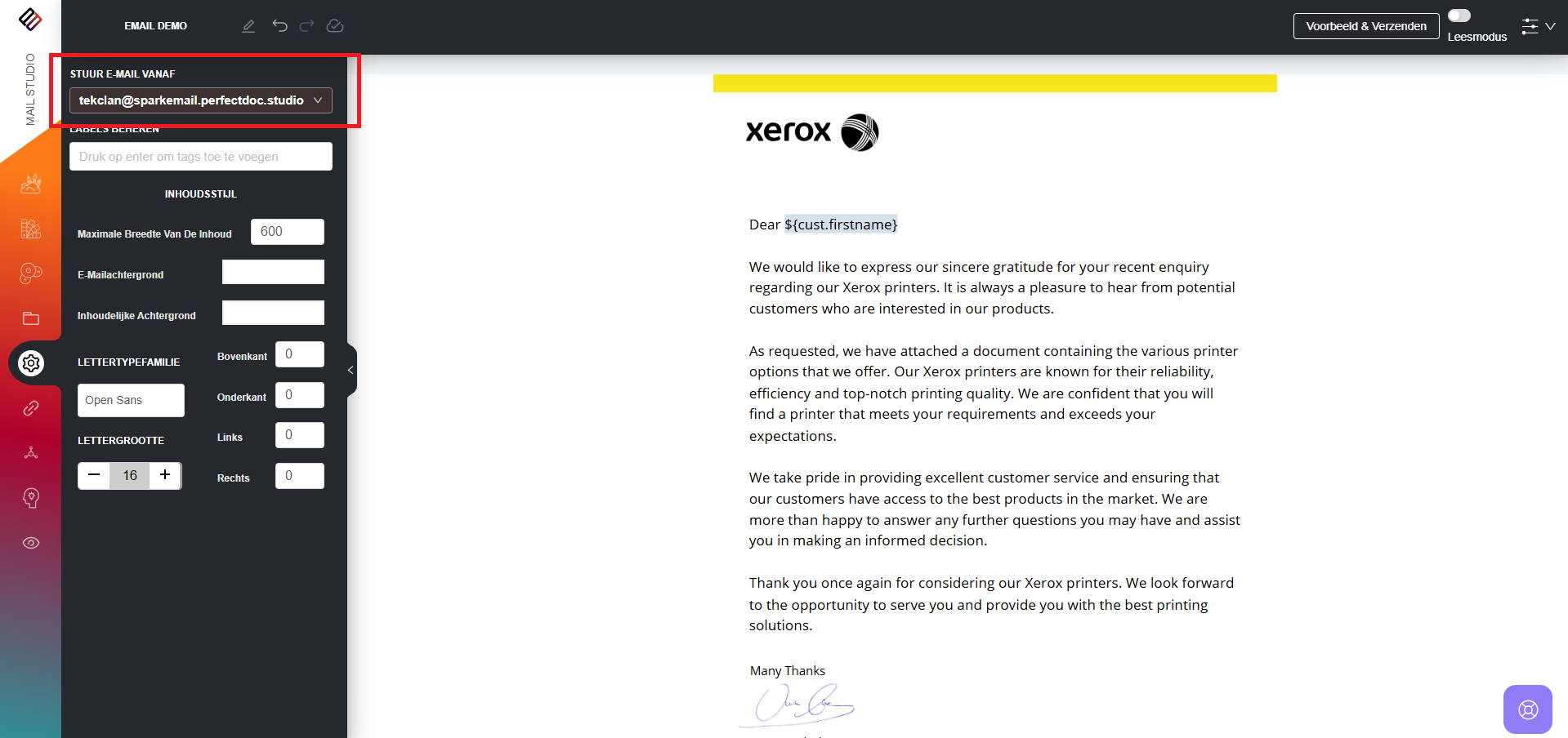 Om er zeker van te zijn dat de e-mail correct naar de klant wordt verzonden, kunnen we ook een testmail naar onszelf sturen om te controleren of alles perfect is. Volg deze stappen: 1. Klik in de rechterbovenhoek van de pagina op de knop ‘Voorbeeld ...
