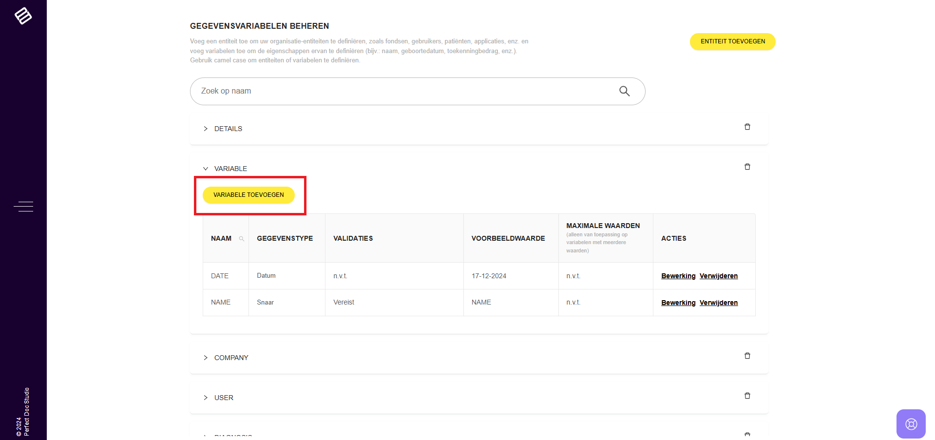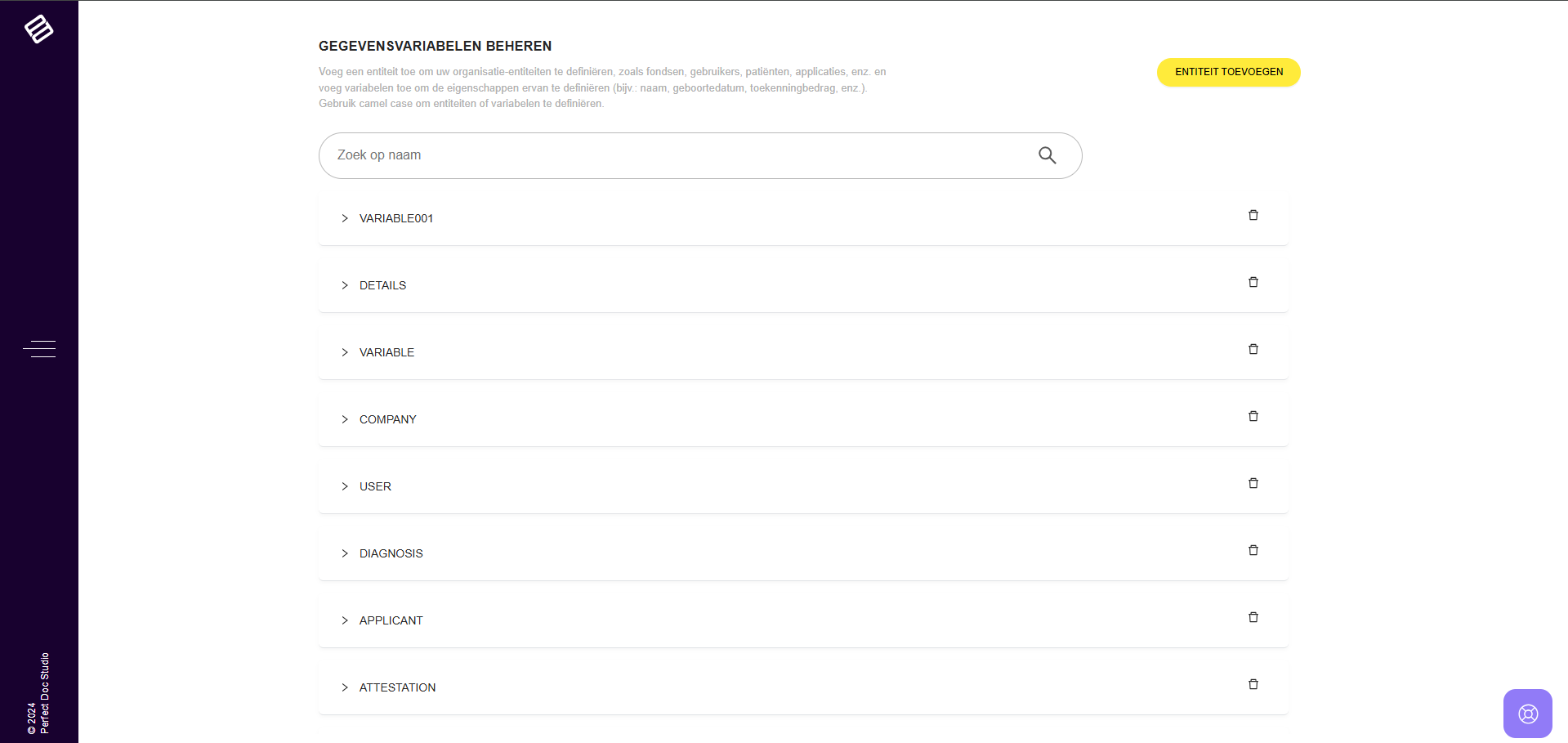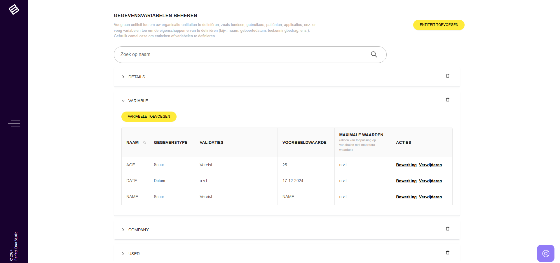 In Perfect Doc Studio worden variabelen op globaal niveau beheerd, zoals wordt gedemonstreerd in de bijbehorende video. Het systeem bevat entiteiten die variabelen huisvesten, en definieert alle relevante datavariabelen voor uw bedrijf. Dit zorgt ...