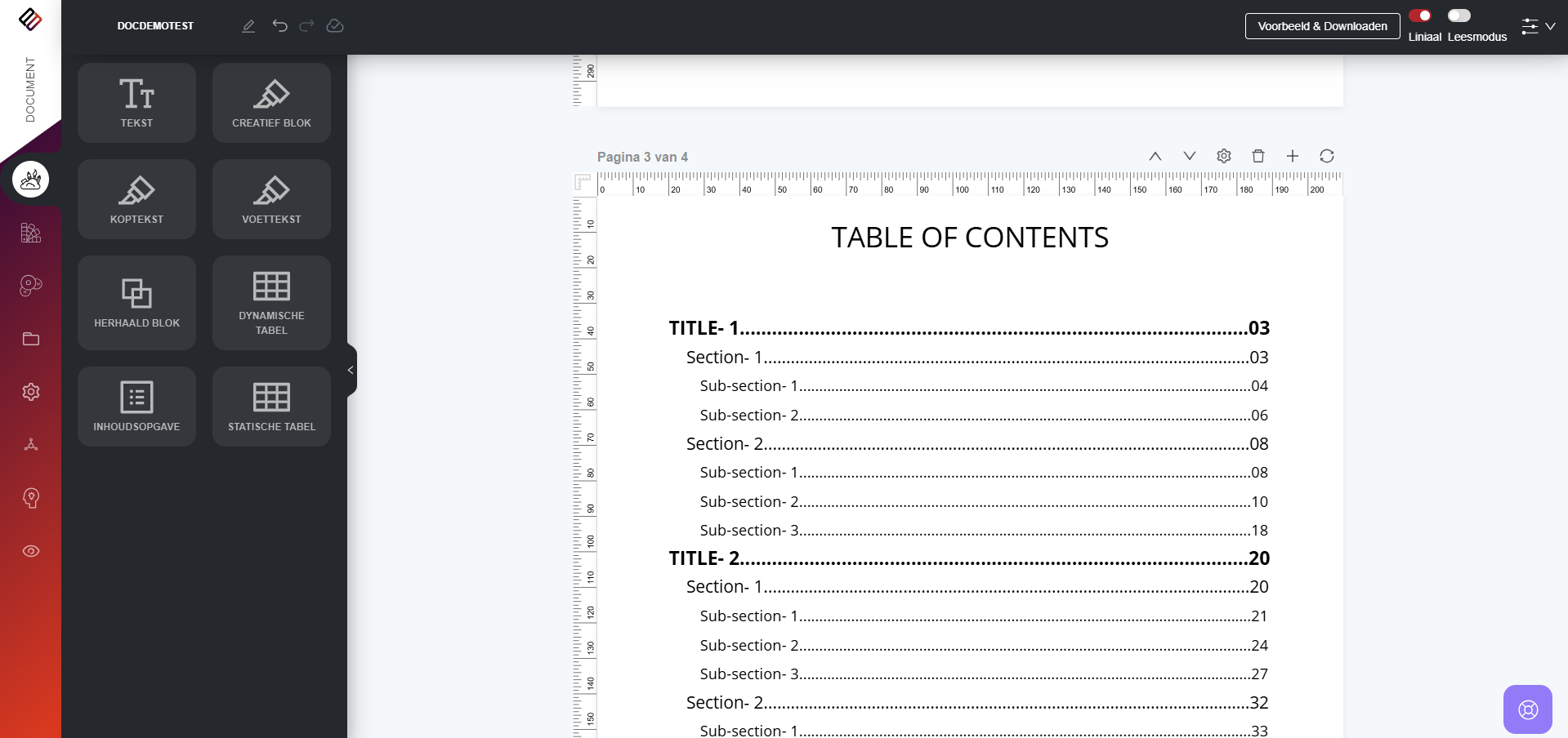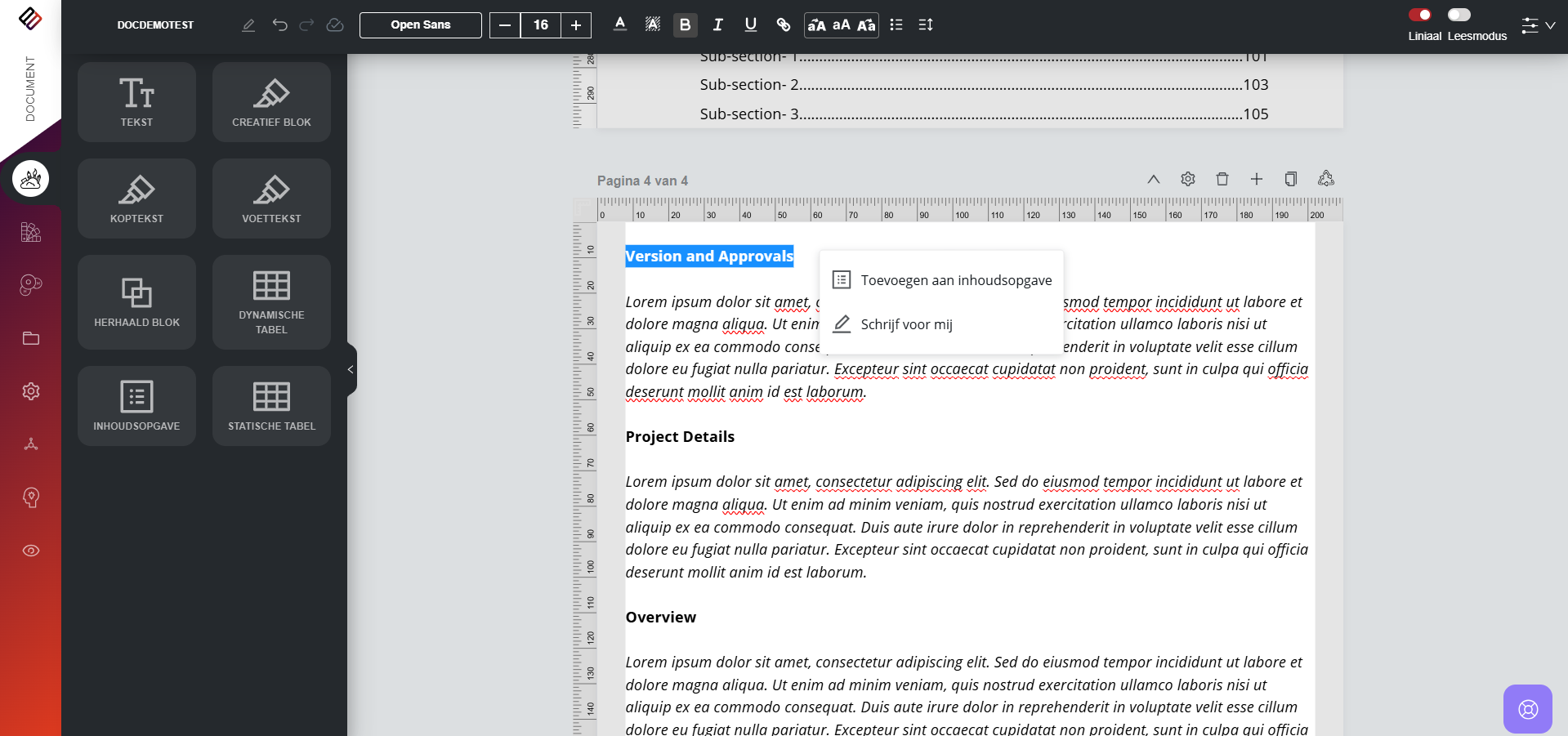Gebruikers kunnen herbruikbare pagina's en secties binnen een documentsjabloon maken. Dit betekent dat ze een heel document kunnen ontwerpen voor hergebruik in een andere sjabloon of specifieke componenten, zoals headers, kunnen bouwen en deze kunnen ...