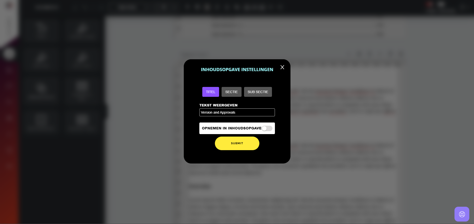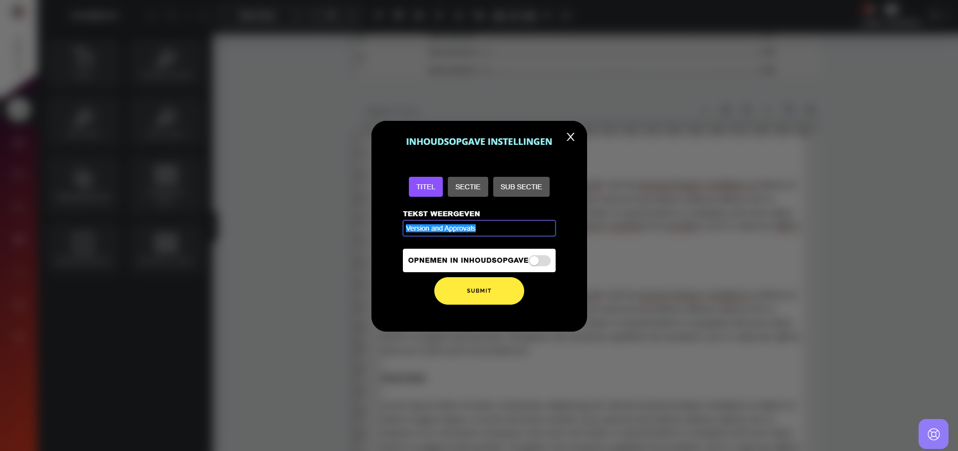 4. Er verschijnt dan een venster waarin u de tekst kunt aanwijzen als een titel, sectie of subsectie in de inhoudsopgave.