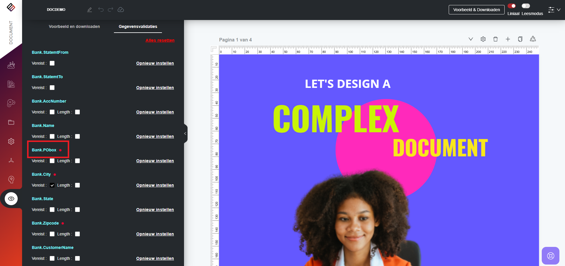 Om onnodig gebruik van documenttellingen te voorkomen wanneer variabelen leeg worden gelaten, is de functie Gegevensvalidaties beschikbaar in de sectie Voorbeeld en downloaden van de documentsjabloon.
