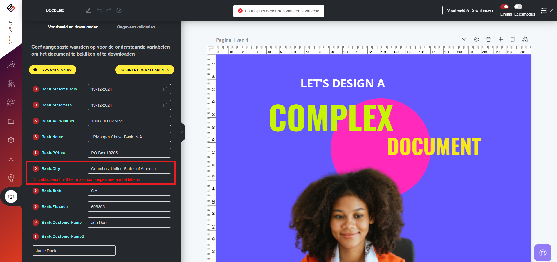 Als de maximale tekenlimiet van een variabele is ingesteld op 20 en er wordt een invoer verstrekt die deze limiet overschrijdt, kan het systeem geen voorbeeld genereren of het document afdrukken. Er wordt een foutmelding weergegeven die aangeeft dat de tekenlimiet is overschreden.