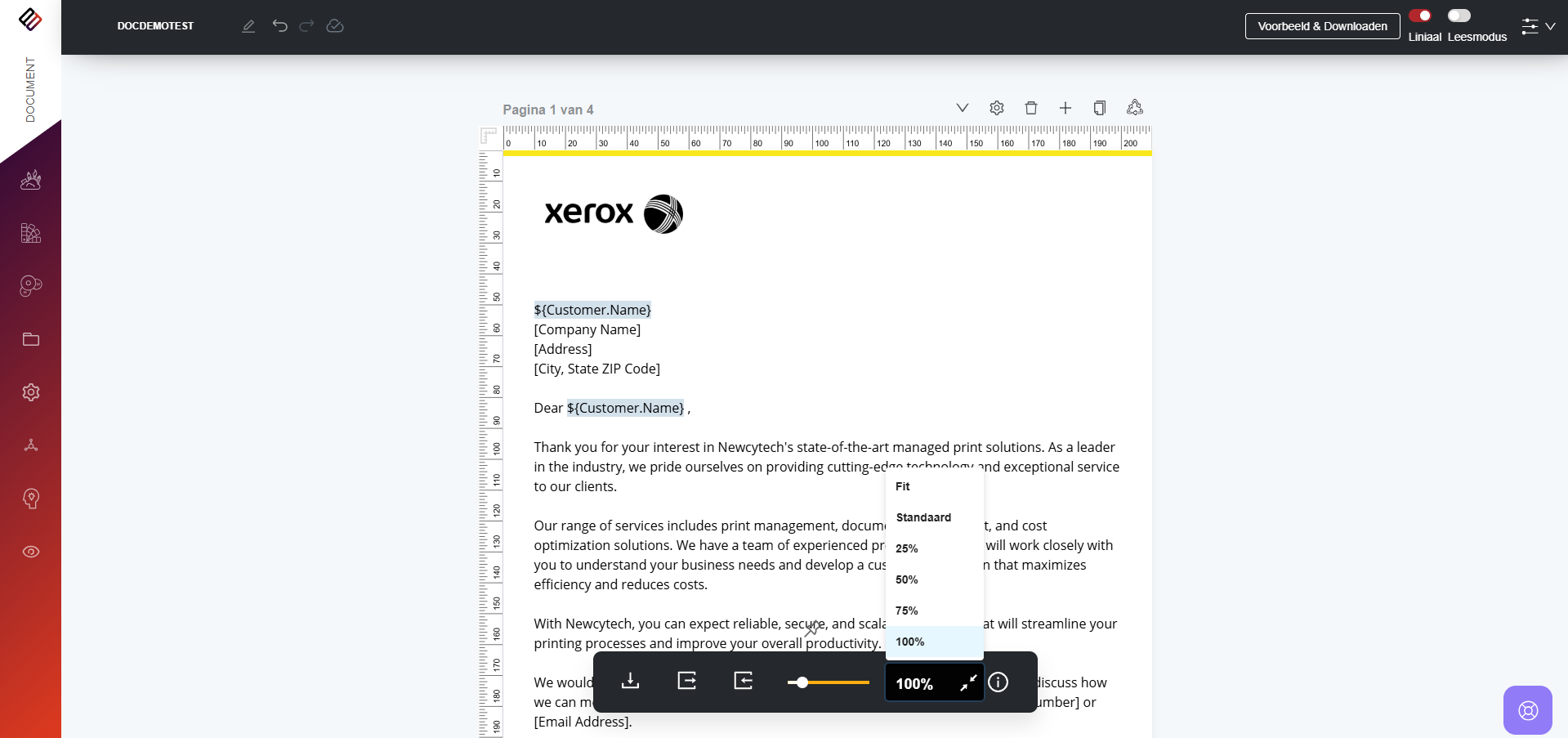 Om de vergroting van het document aan te passen, gebruikt u de zoombediening in het onderste paneel. Sleep de schuifregelaar naar links of rechts om het gewenste zoomniveau in te stellen. Als u een specifiek zoomniveau als standaard wilt instellen, selecteert u het niveau en klikt u op de knop "Set Default Zoom". Dit blijft het standaardzoomniveau voor het document totdat u besluit het te wijzigen. Daarnaast is er een vervolgkeuzelijst met vooraf ingestelde zoomniveaus beschikbaar, zodat gebruikers eenvoudig hun voorkeursoptie kunnen selecteren.