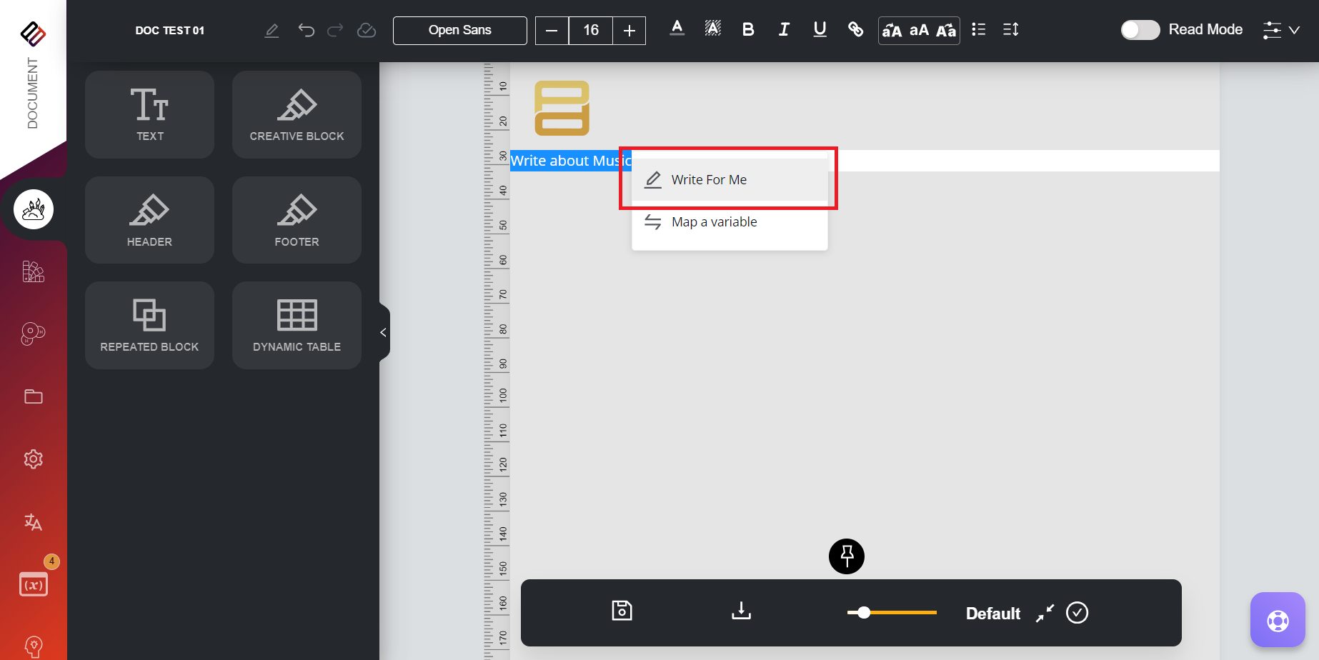 To add text content to a document template in Perfect Doc Studio: 1. Go to the "Let's Design" option the left hand side menu. 2. Click on the "Text" menu option in the left panel. 3. Drag and drop the desired text content as text blocks onto the ...