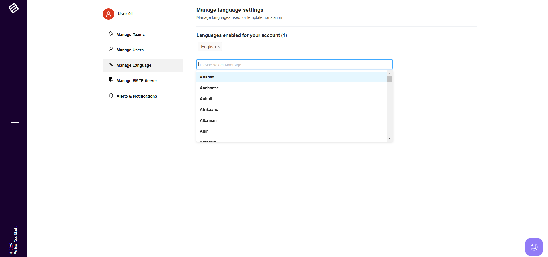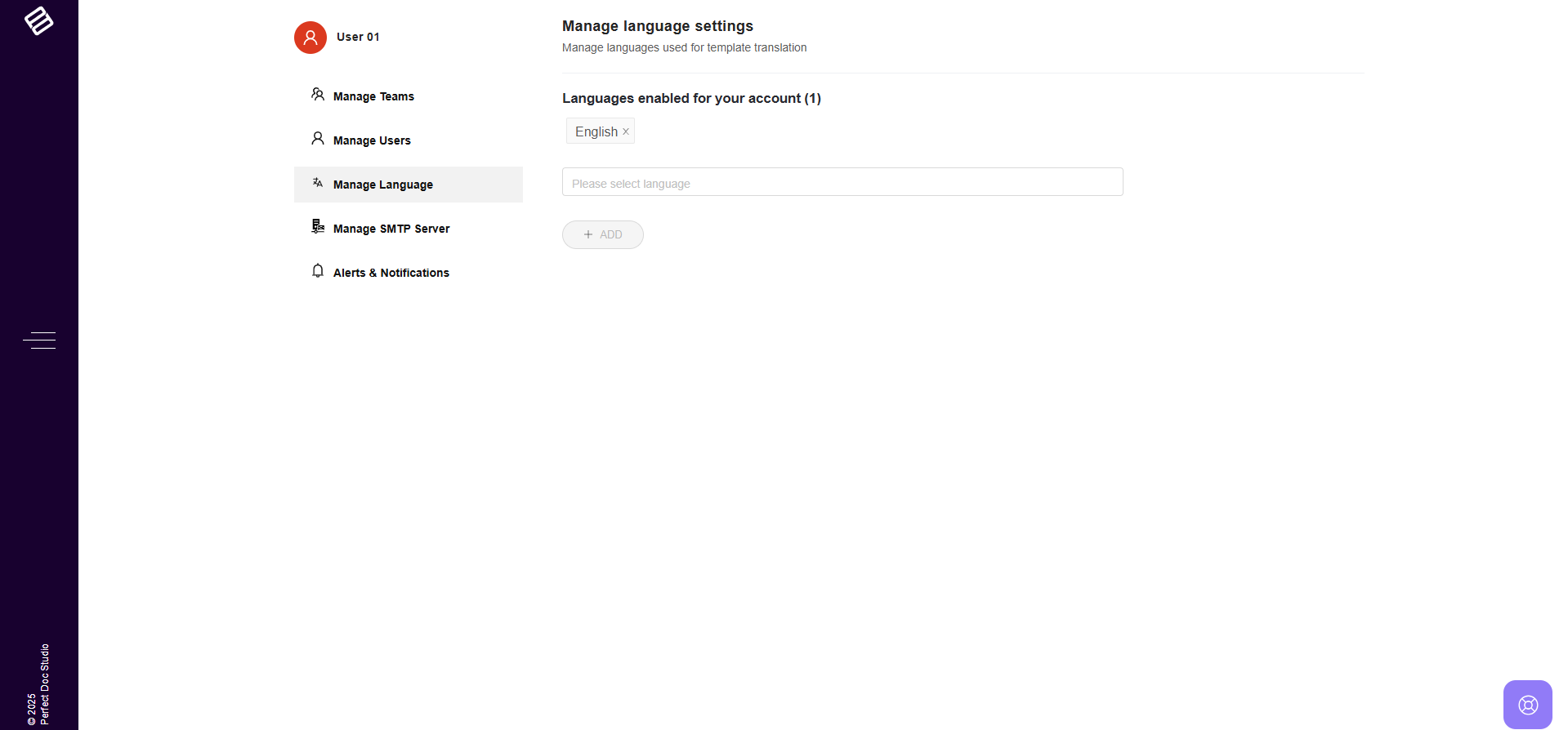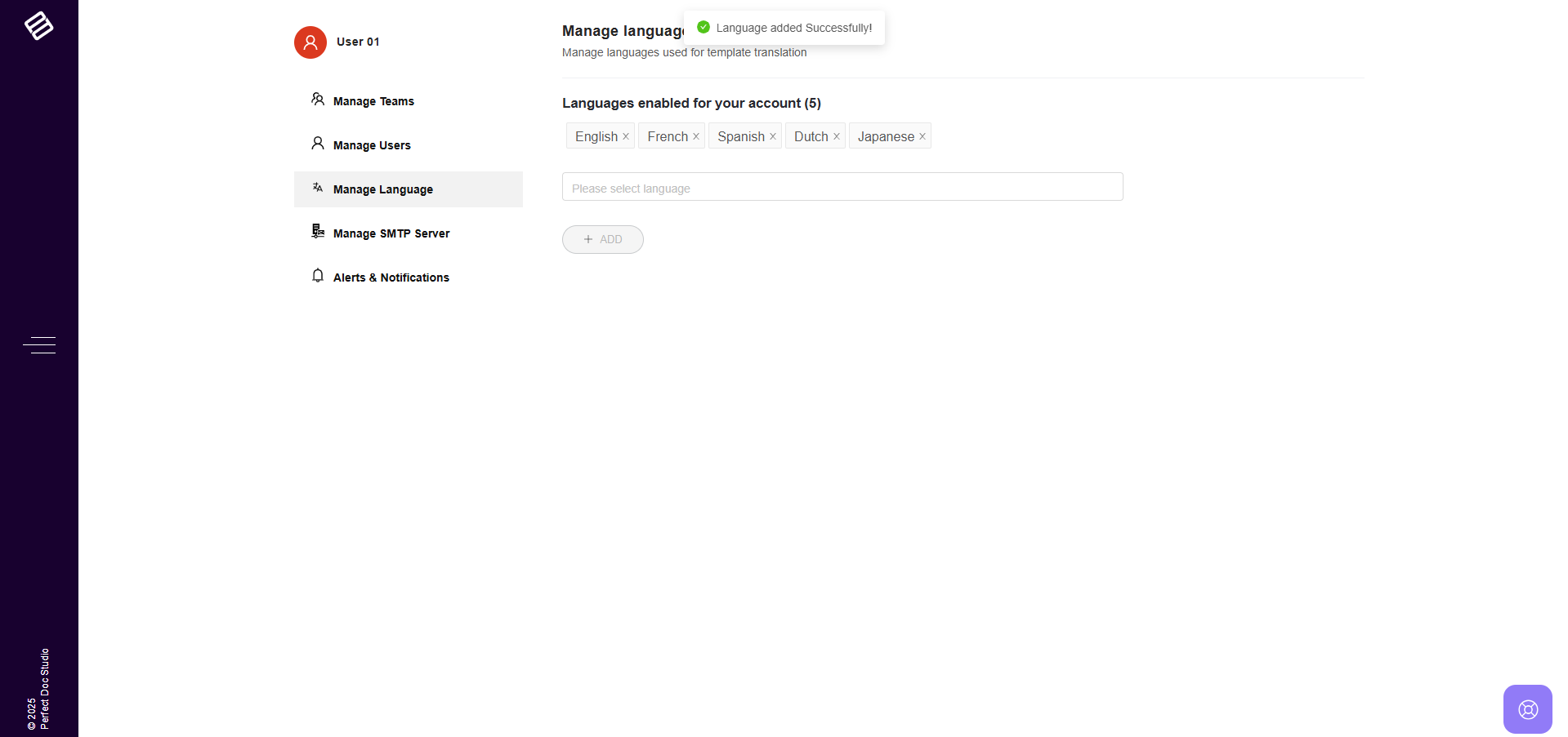 Perfect Doc Studio supports up to five languages at a time for generating documents and emails, with availability depending on your subscription plan. To enable this feature, you must add the required languages to the system. Follow these steps: