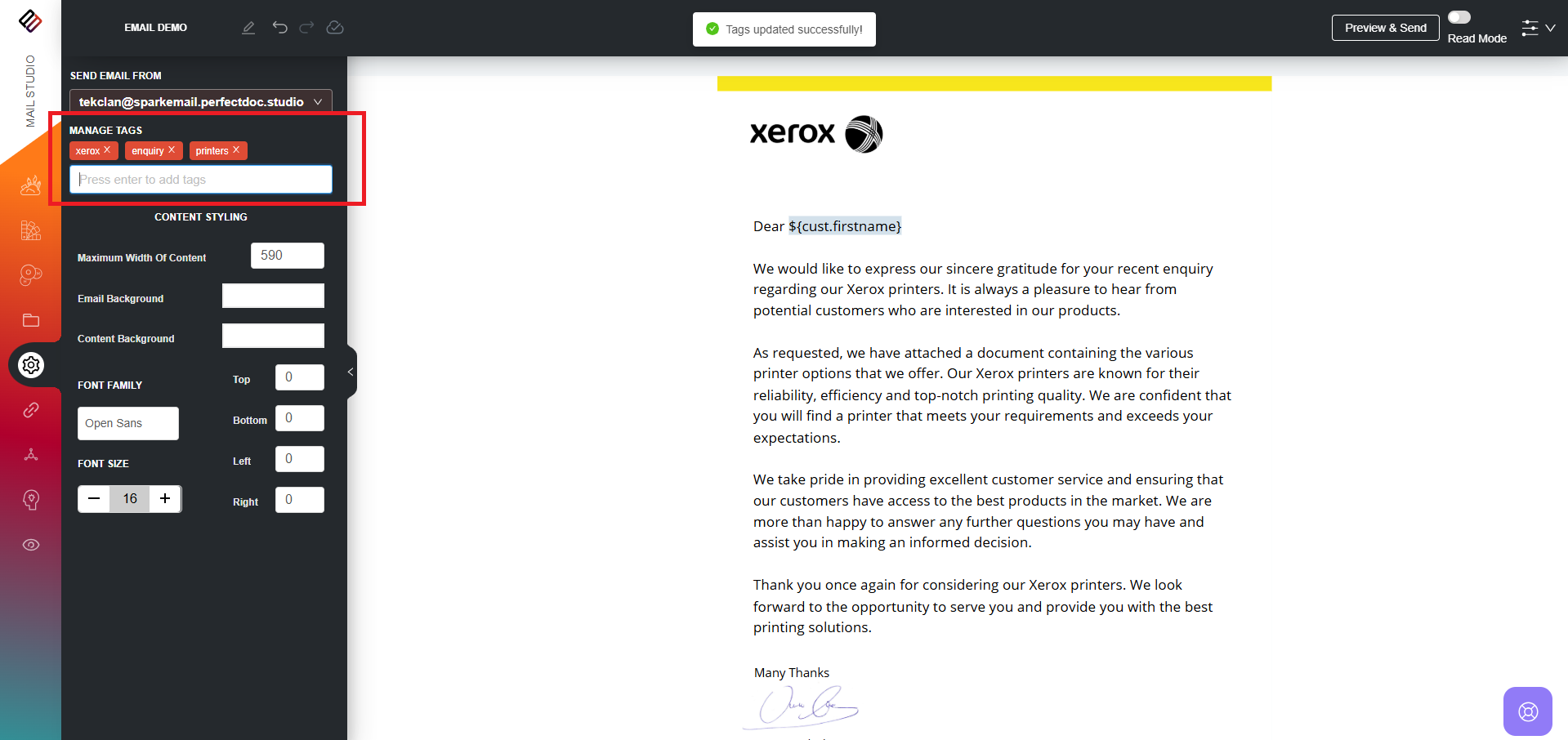 Similar to the document system, the "Manage Tags" feature allows you to associate specific keywords with email templates. These tags make it easier to search for templates. Simply enter a tag and press "Enter" to link it to the email template.