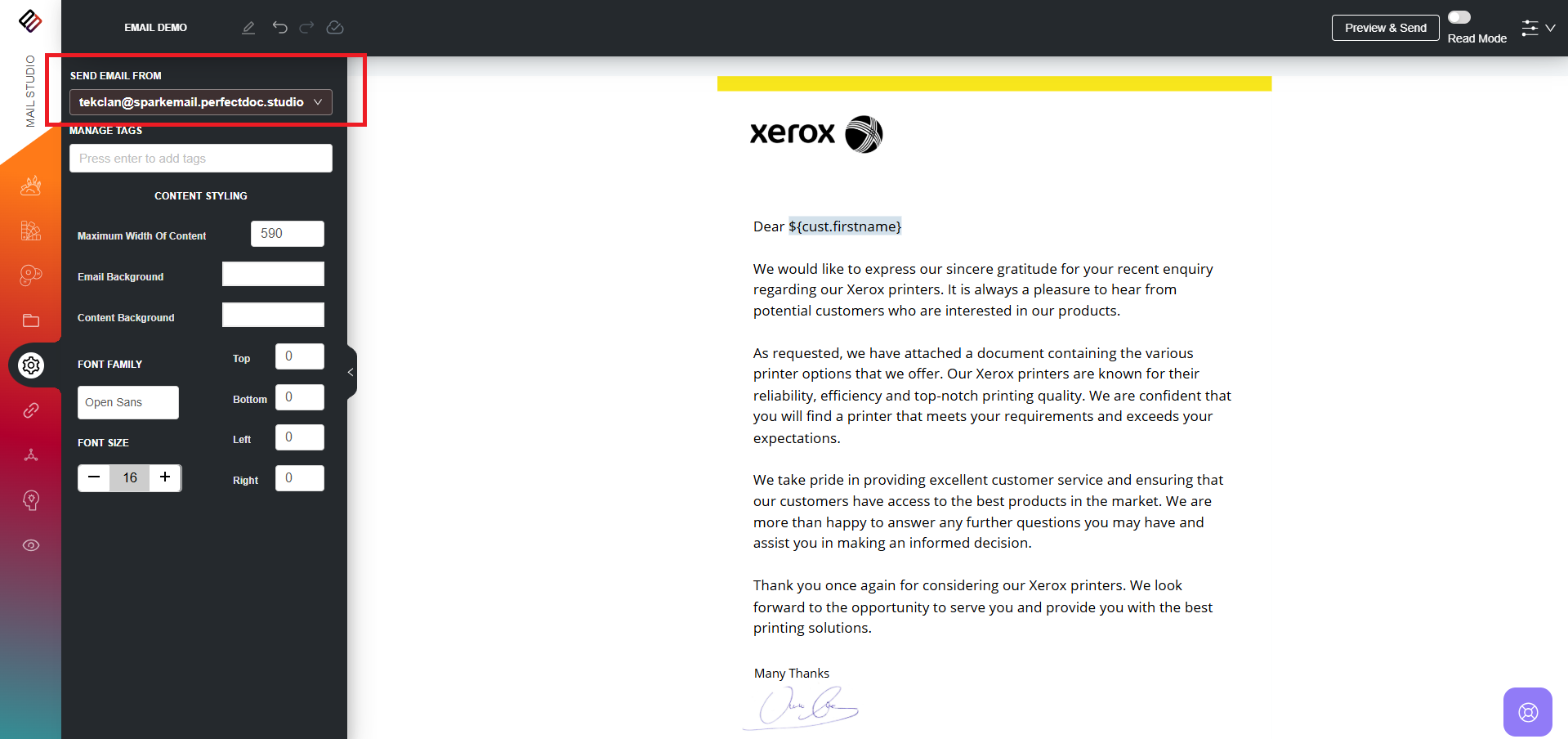 Specify the default font style and size for the email template using this option. These settings will apply throughout the template