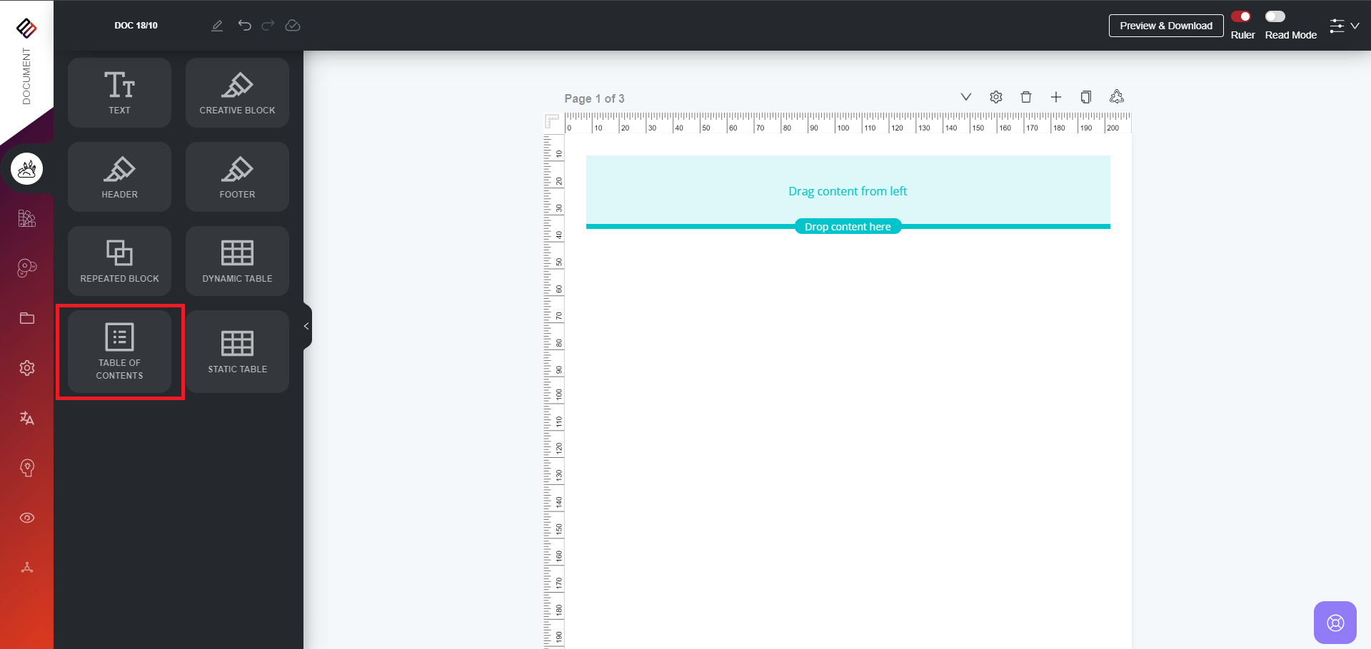 2. Simply drag and drop the Table of Contents section above or below any current page. The user can include the TOC at any point of time while creating a document.
