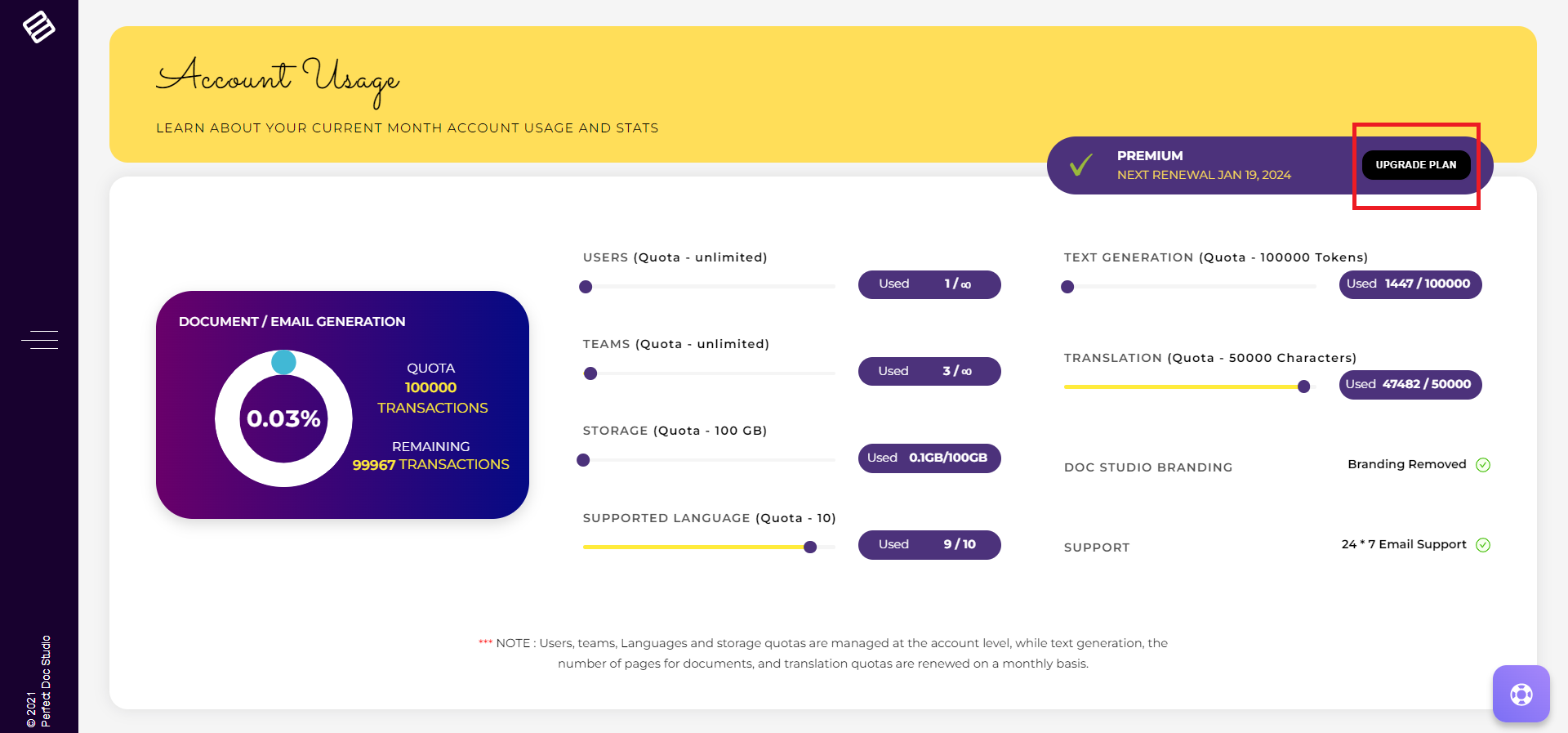 The Account Usage page provides detailed information about the quotas for total transactions, storage, supported languages, text generation, translation, as well as user and team limits. These quotas vary based on the subscription plan. Every aspect related to the current plan is accessible here.