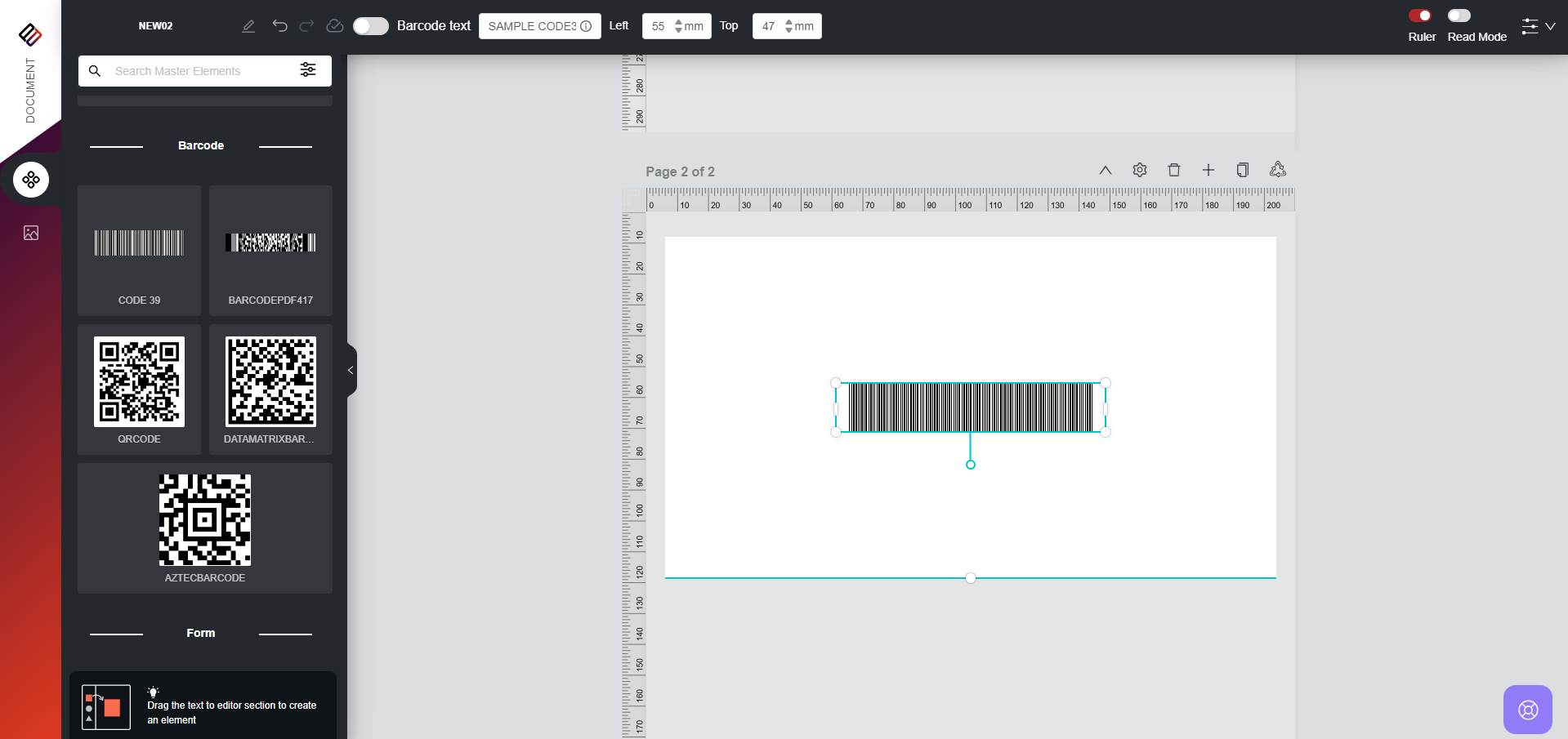 To generate dynamic barcodes in document templates, simply drag and drop the barcode master element from the master elements section, as demonstrated in the image below.