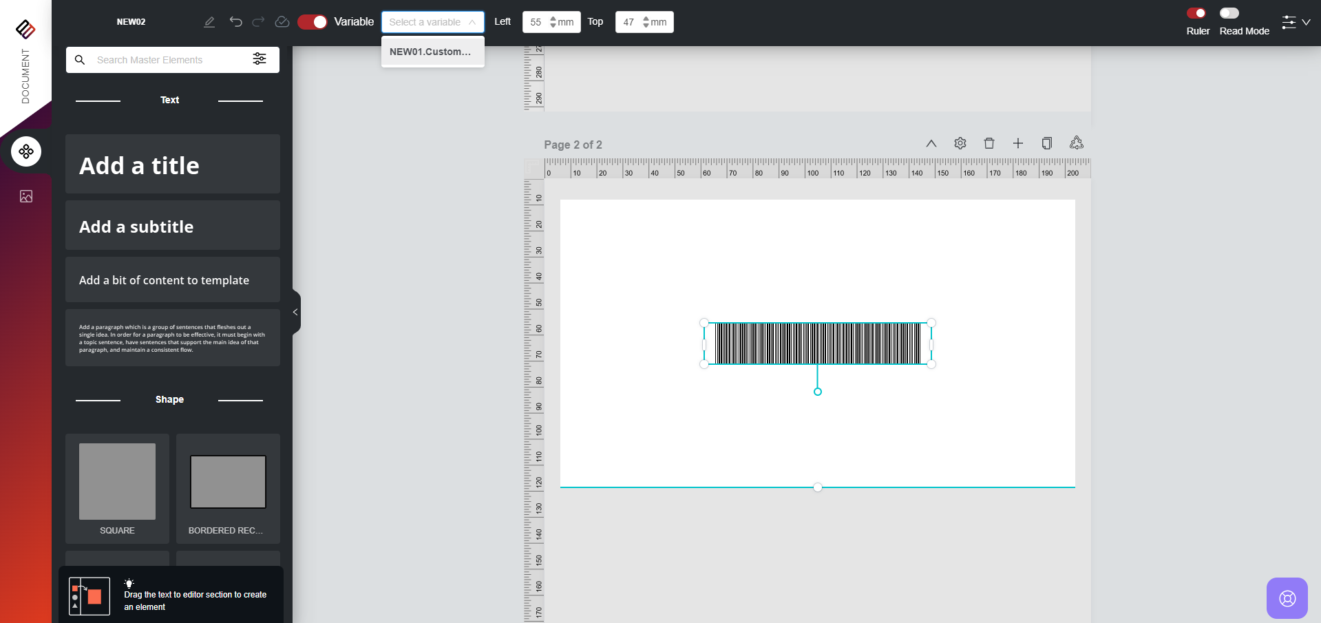 To generate dynamic barcodes, simply select the desired barcode type from the master elements section and drag and drop it onto the document template. Toggle the "Switch to Variable" button, then choose a variable from the drop-down menu located above the barcode element, as illustrated in the image below. The variable value supplied during document generation can be used to automatically generate custom barcodes.