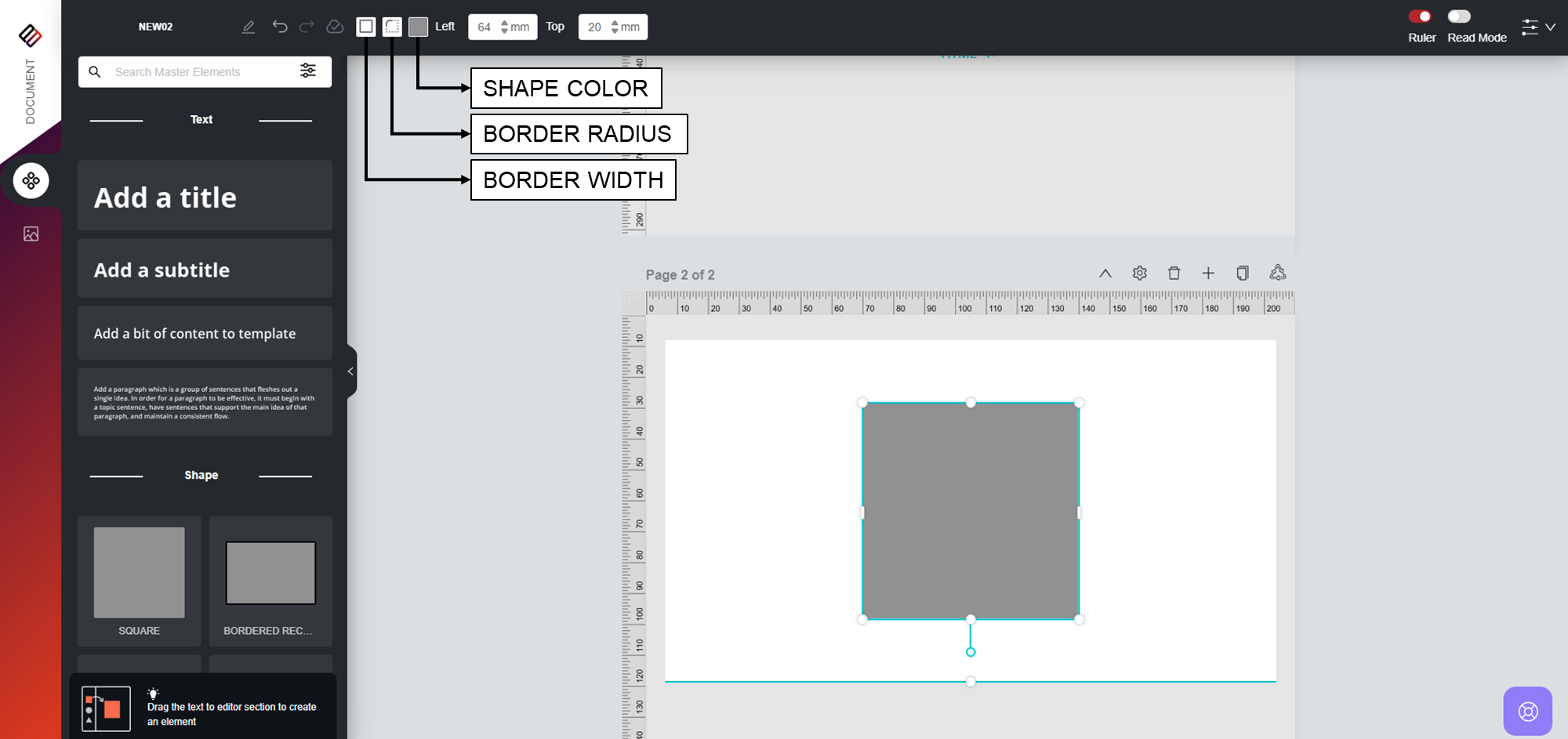 After a shape is included in the template, it's possible to modify its color, border radius, and border width, as displayed in the example below.