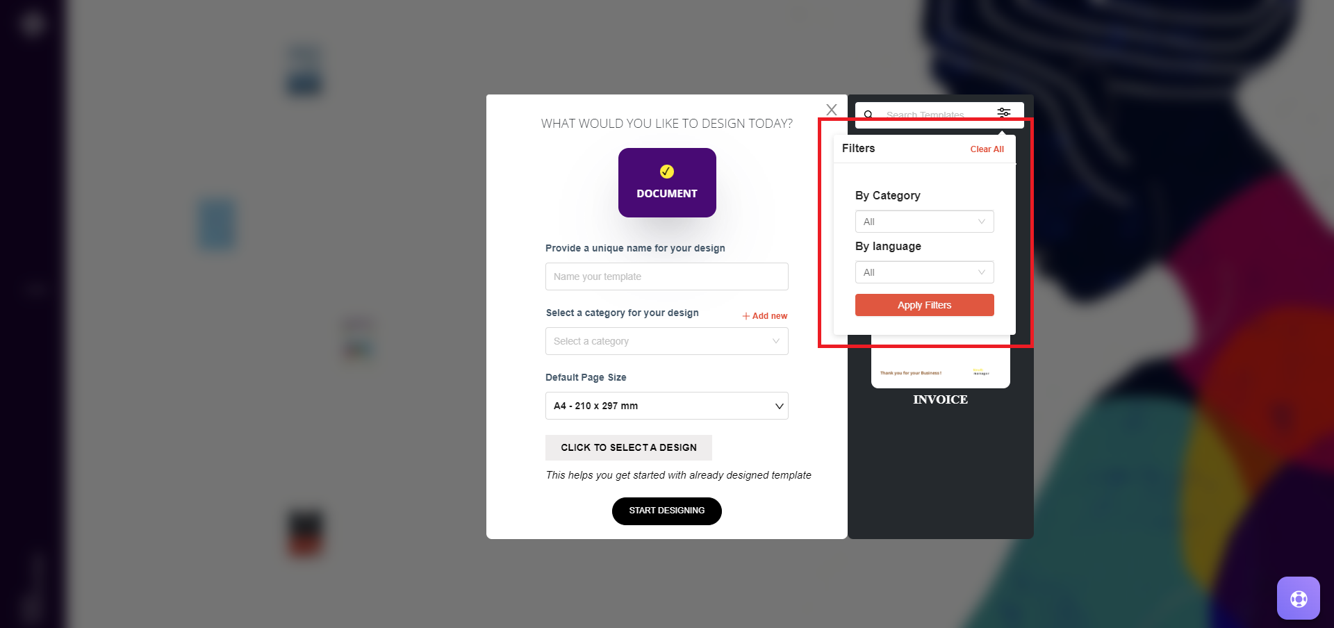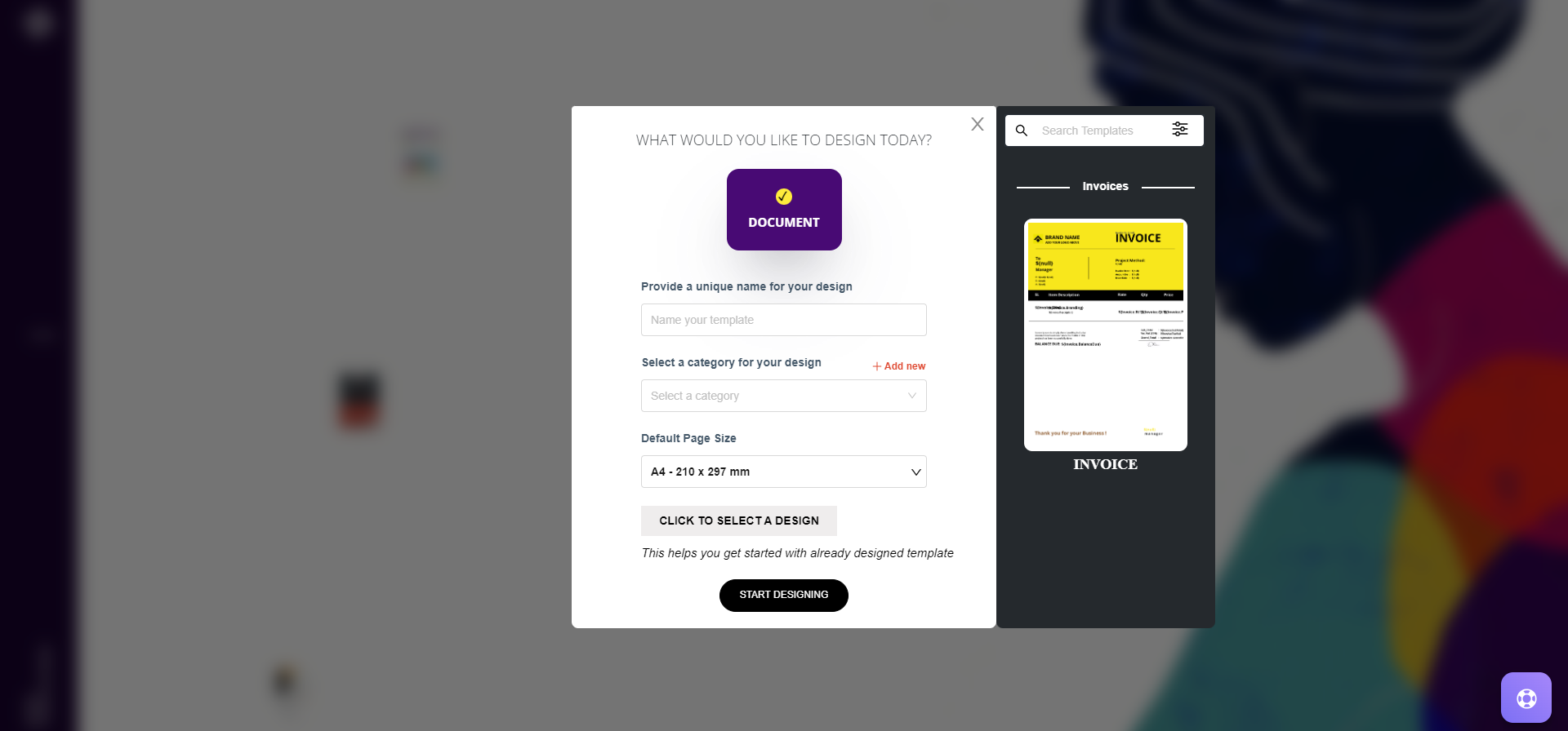 1. While creating a document, after entering the necessary information such as the document name, category, page size, and team, the user will see an additional button labeled "Click here to select a design."