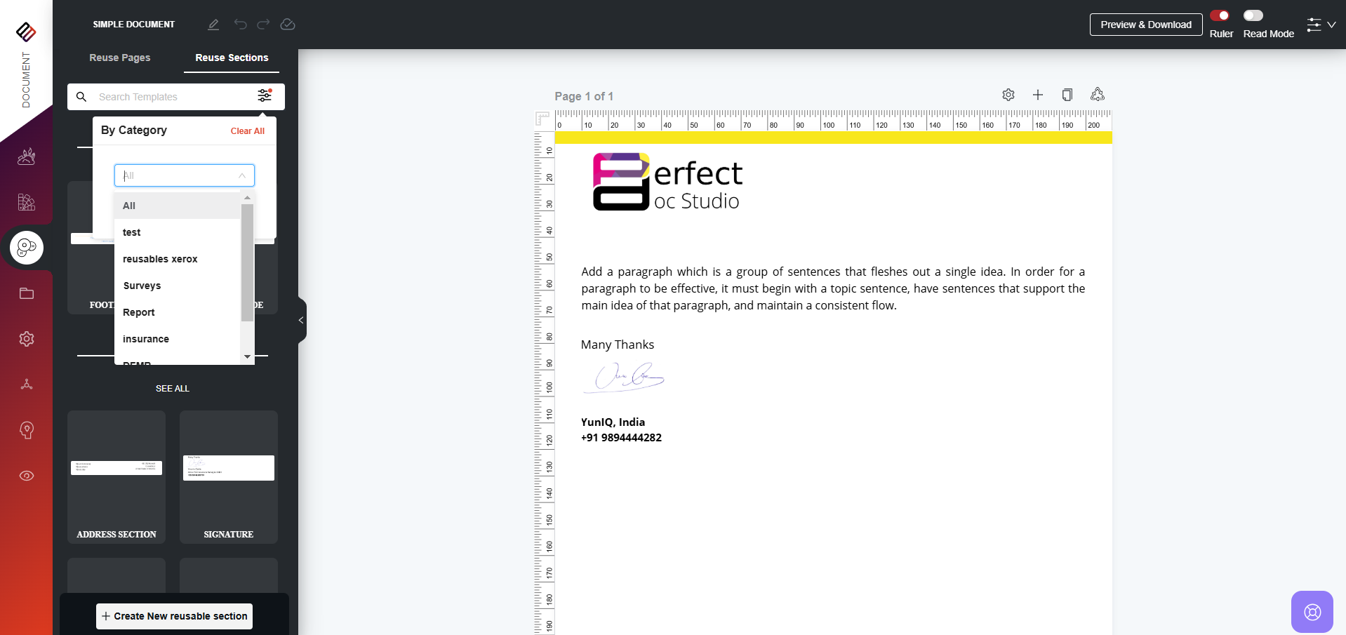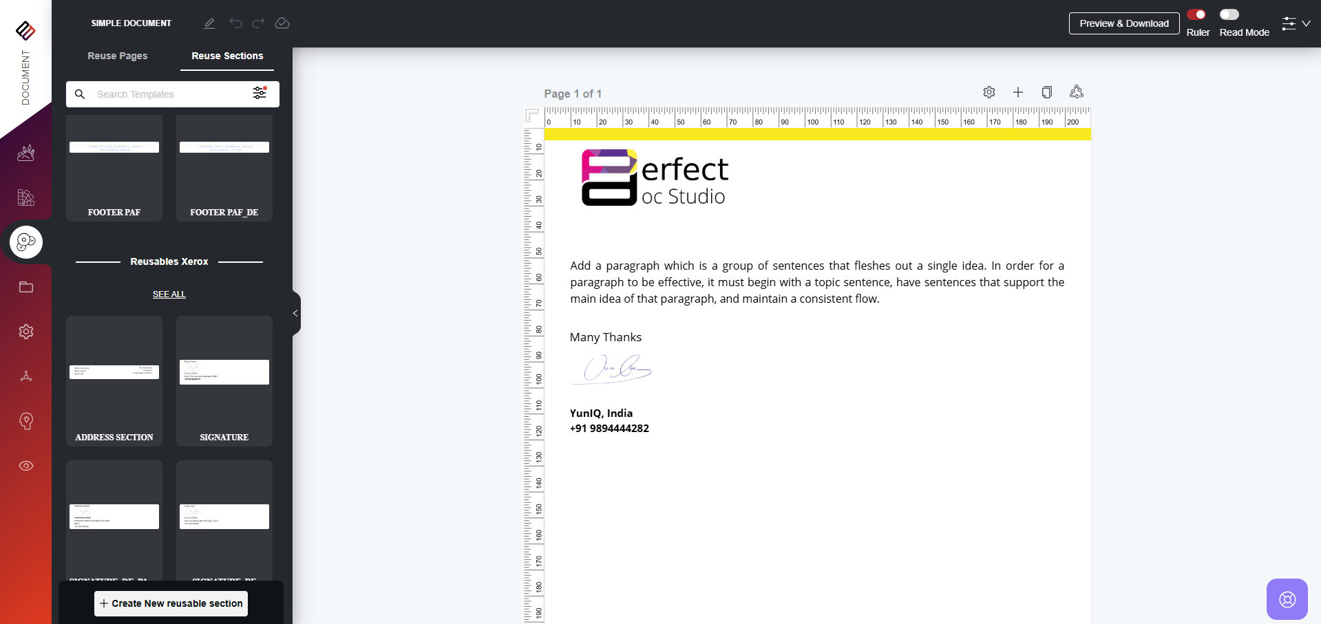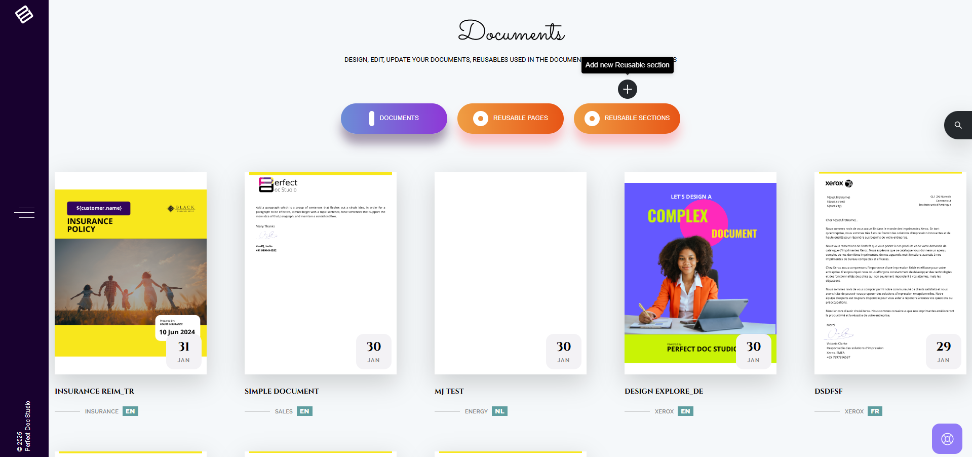 Users can create reusable pages and sections within a document template. This means they can design an entire document for reuse in another template or build specific components—like headers—and save them as reusable sections for future use.