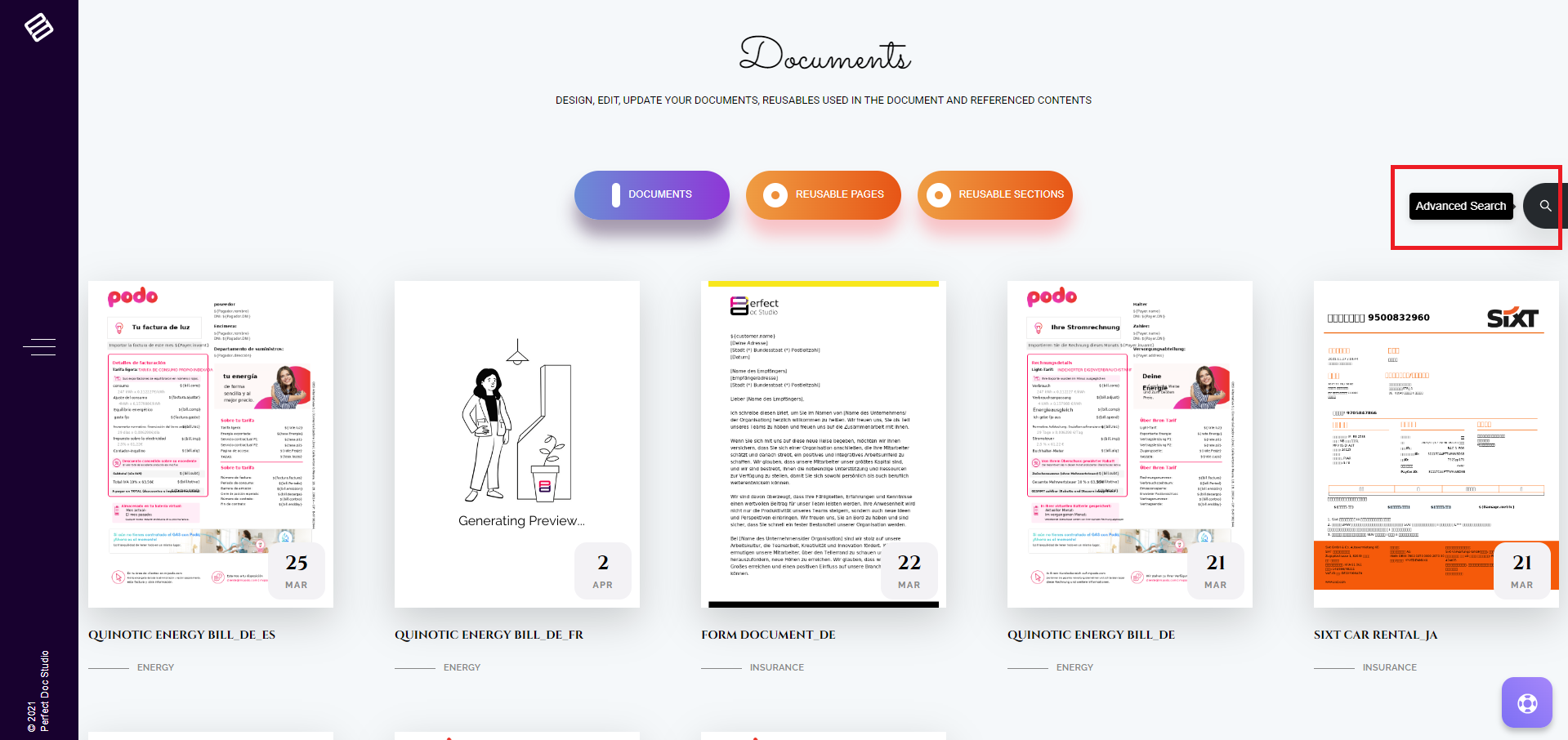 To view/access all the document templates created for your team in the system, follow these steps: 1. Go to the menu option on the left-hand side of the screen. 2. Click on "Design System" and then select "Documents". 3. You will now be able to see a ...