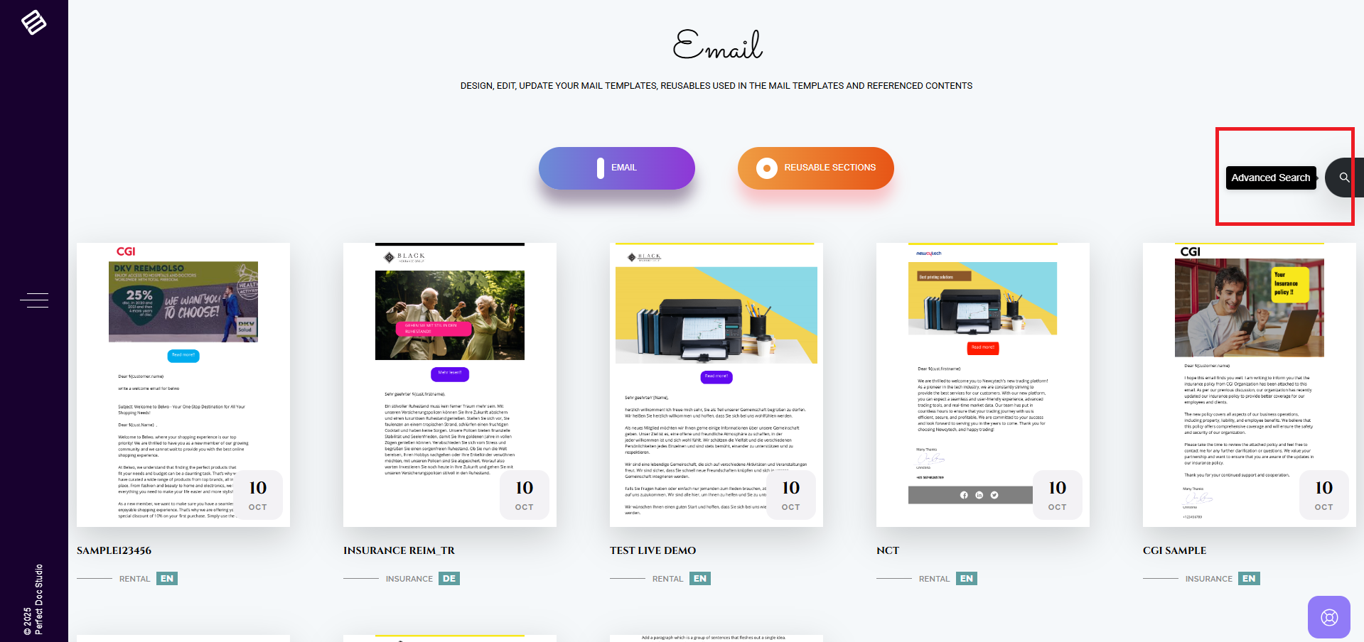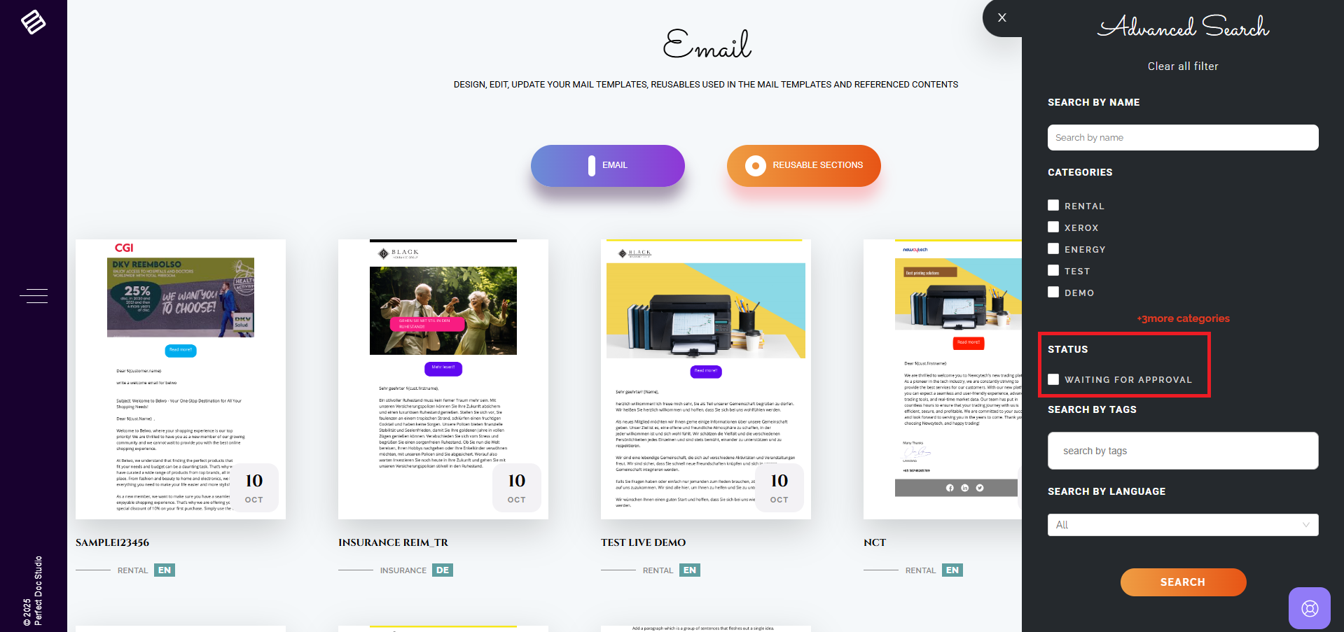 5. From the sidebar, you can search for the email templates based on name, categories, tags, and status of the document.