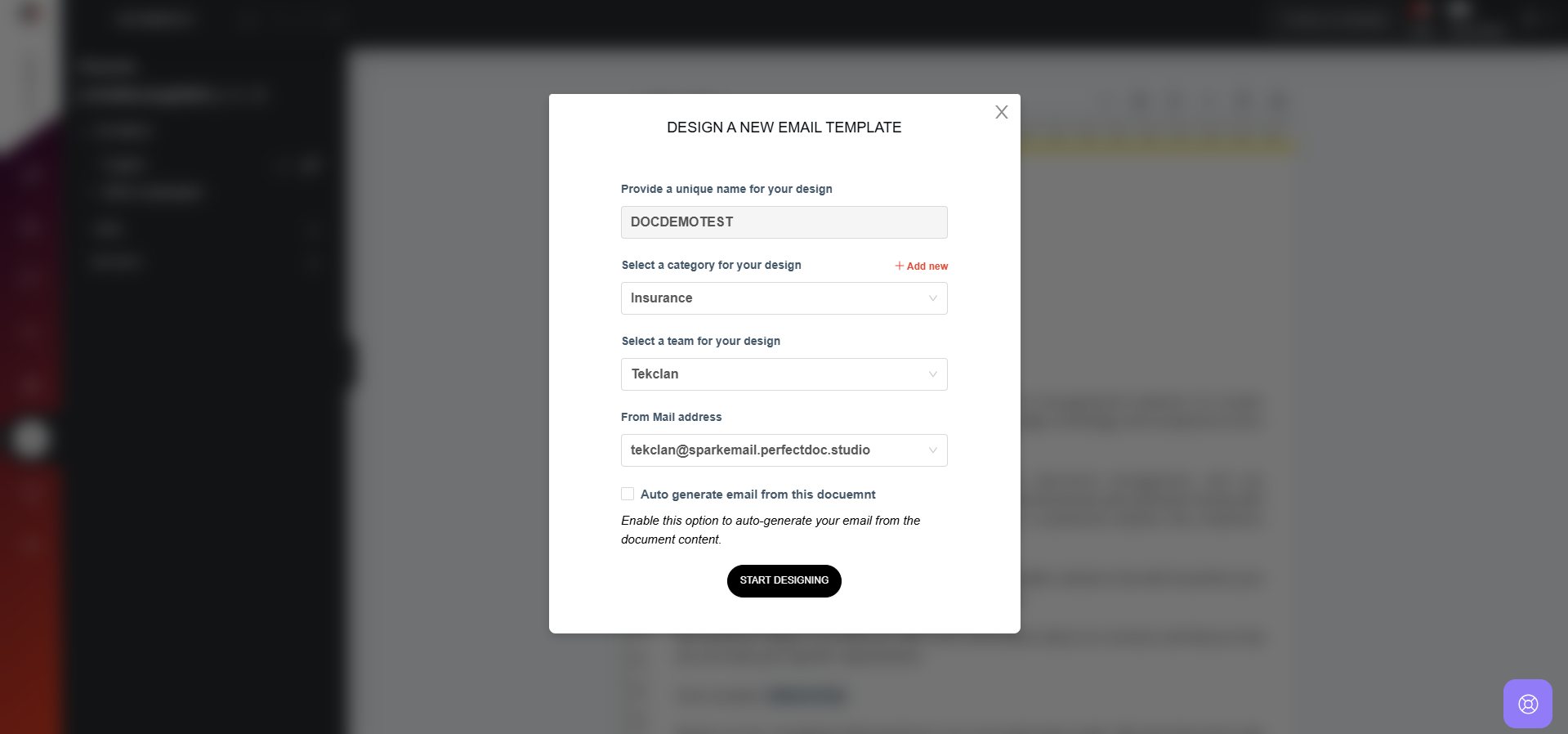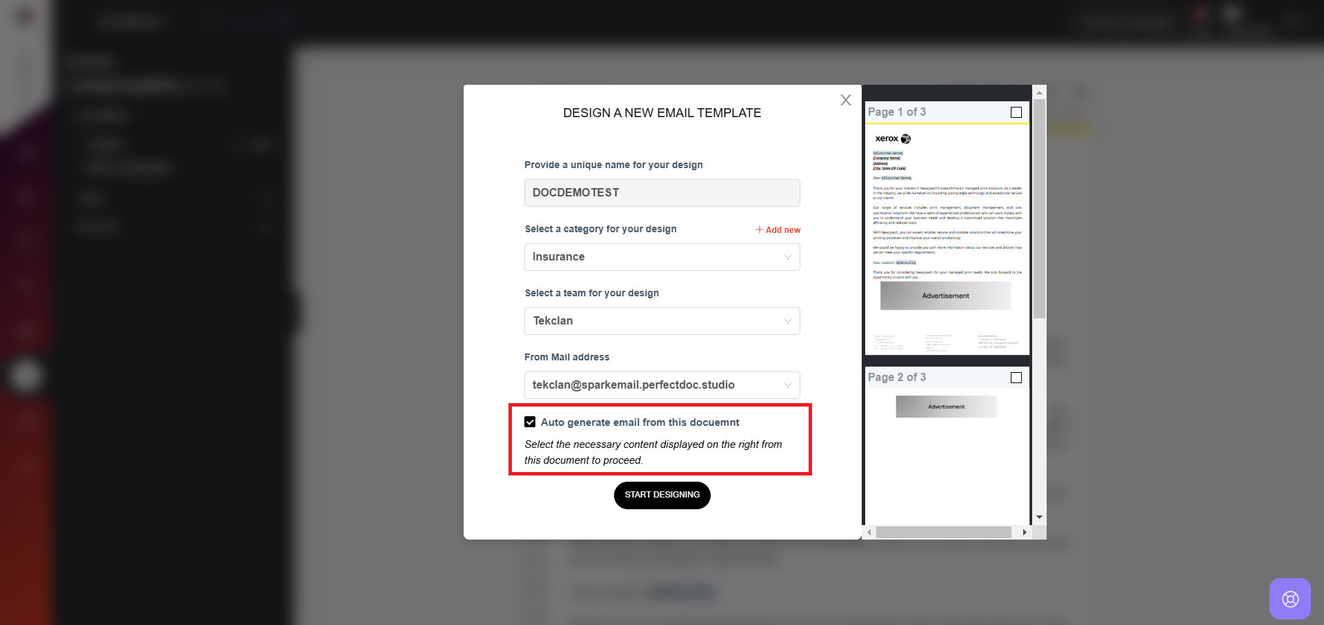6. Once you click "Start Designing", an email template will be created with the same name and automatically linked to the document.