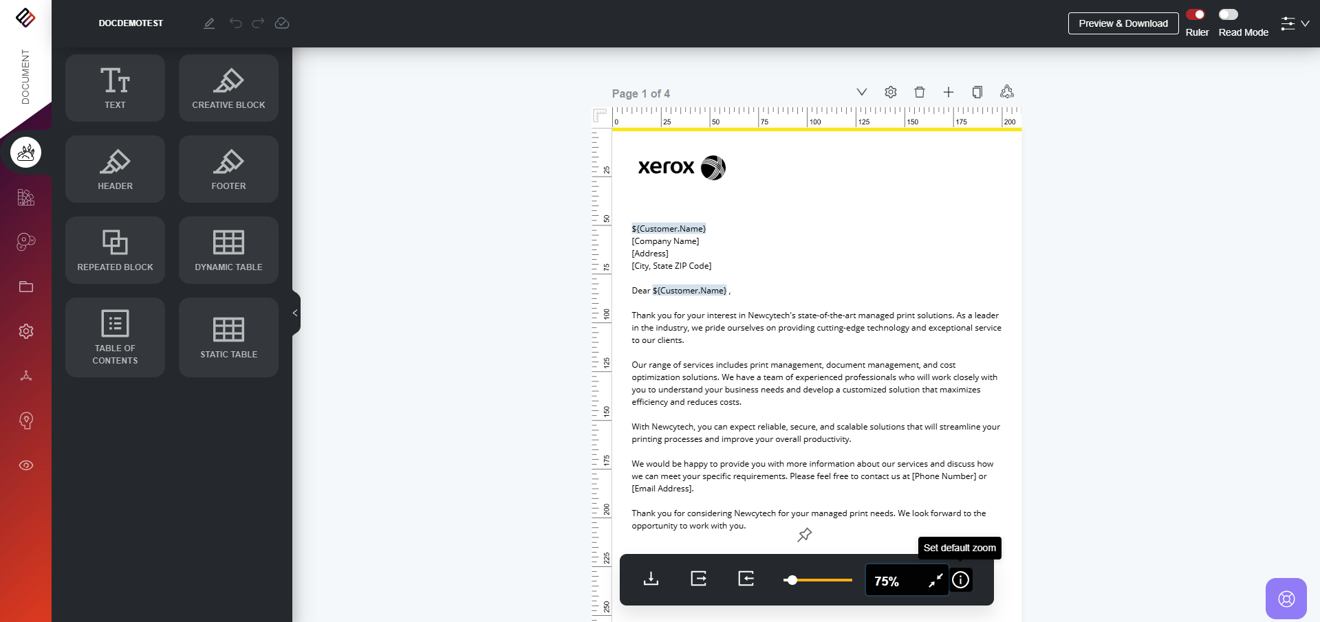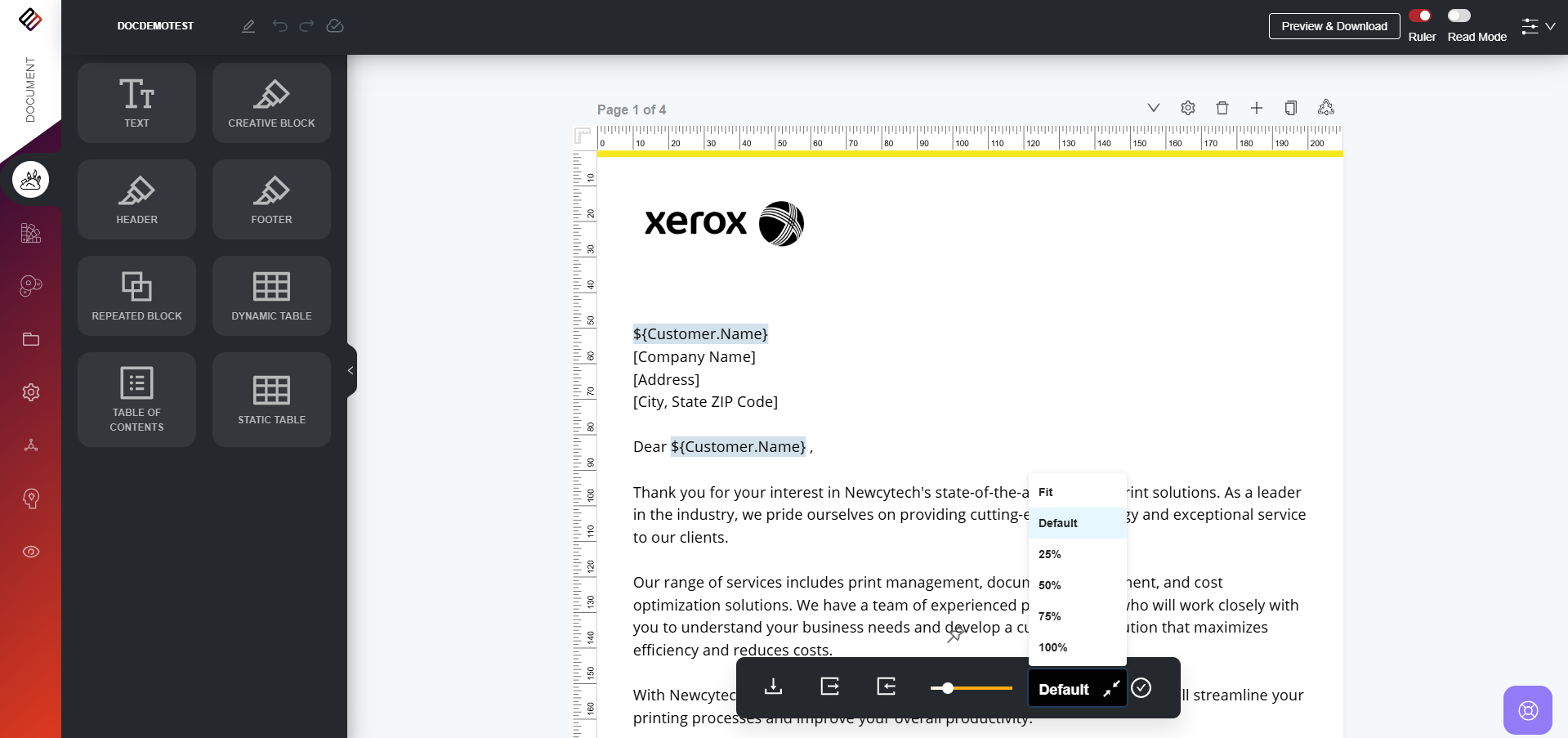 To adjust the magnification of the document, use the zoom control located in the bottom panel. Drag the slider left or right to set your desired zoom level. If you wish to make a specific zoom level the default, select the level and click the “Set Default Zoom” button. This will remain the default zoom level for the document until you choose to change it. Additionally, a dropdown list of preset zoom levels is available, allowing users to select their preferred option easily.
